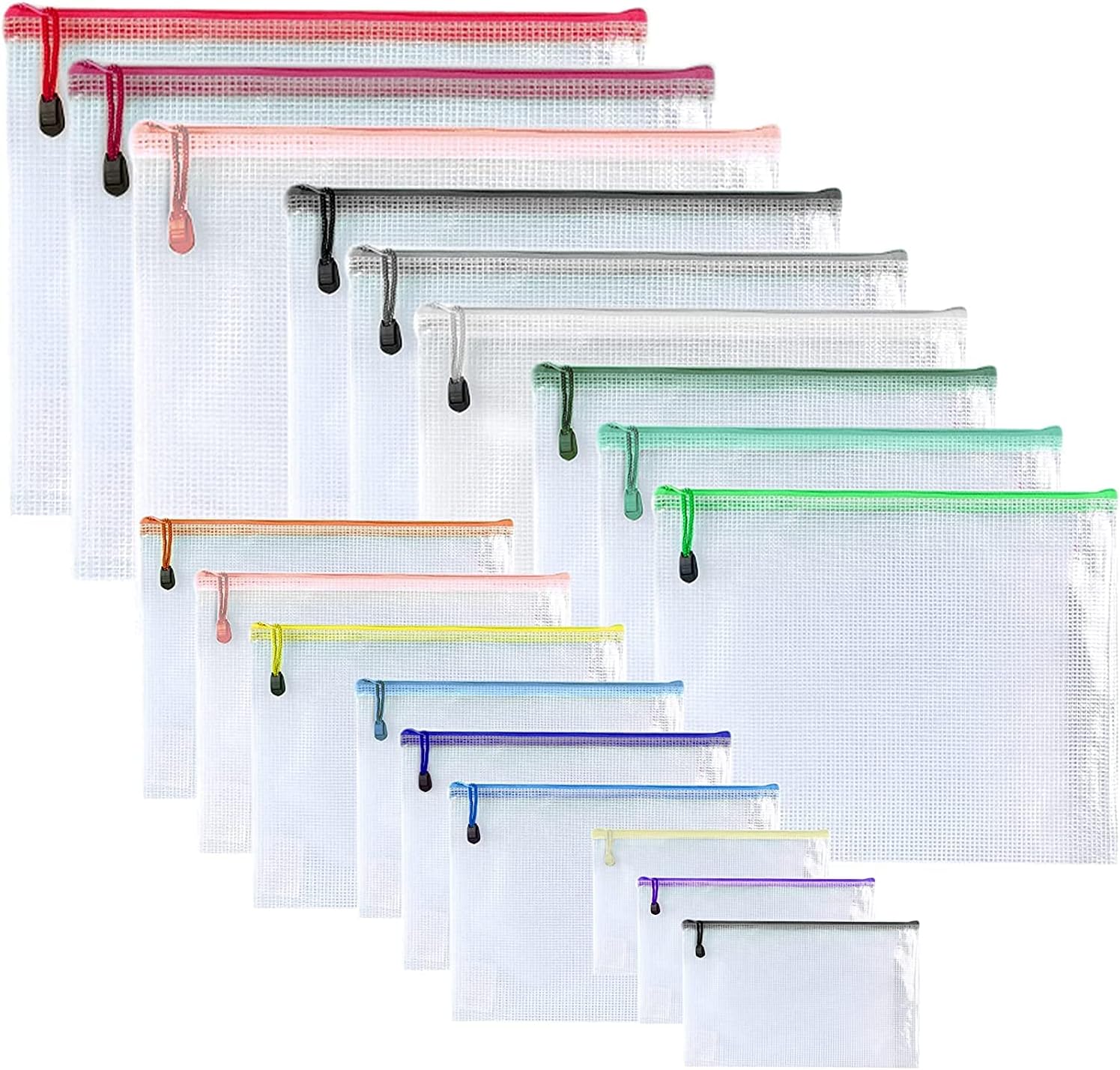 Oaimyy-18 Pcs,Plastic Mesh Zipper Pouch Document Folders Bag Zipper Zip File Folders for Office Supplies, Travel,Organizing Storage (6 Sizes, Multicolor)