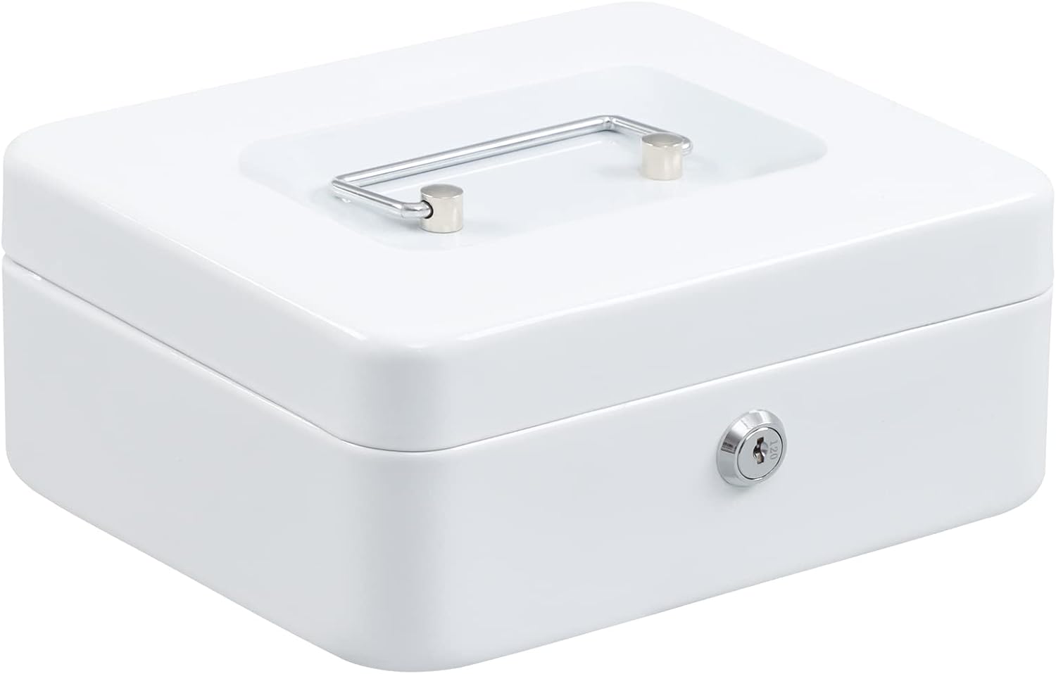 xydled Locking Steel Medium Cash Box with Removable Coin Tray and Key Lock,7.87"x 6.30"x 3.54",White