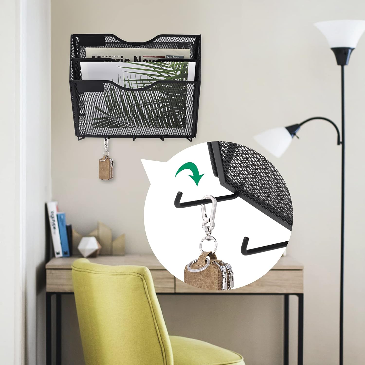 EASEPRES 3 Pocket Mesh Hanging File Organizer with Key Holder Hooks & Nametag Label, Wall Mounted Mail Paper Document Folder Clipboard Storage Organization Magazine Rack for Office Cubicle, Black