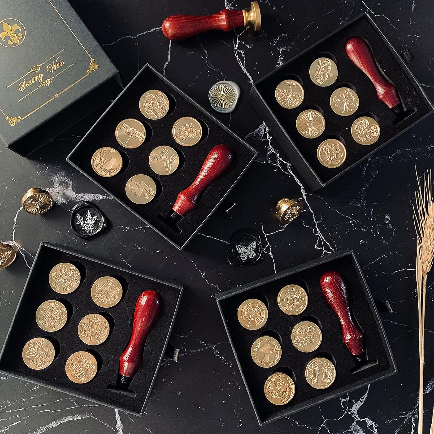 - 【High Quality Material】We carefully check before shipment to ensure that every part is perfect:The removable head is made of high quality brass, with delicate and clear patterns engraved on the golden luster surface, which is comfortable to the touch, easy to replace and install. The handle of the wax seal stamp set is made of high-quality wood, sturdy, durable and soft to handle.