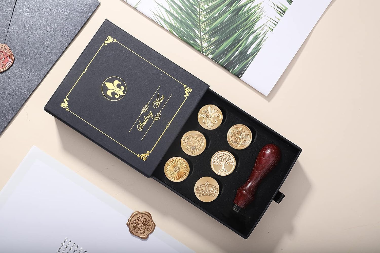 - 【High Quality Material】We carefully check before shipment to ensure that every part is perfect:The removable head is made of high quality brass, with delicate and clear patterns engraved on the golden luster surface, which is comfortable to the touch, easy to replace and install. The handle of the wax seal stamp set is made of high-quality wood, sturdy, durable and soft to handle.