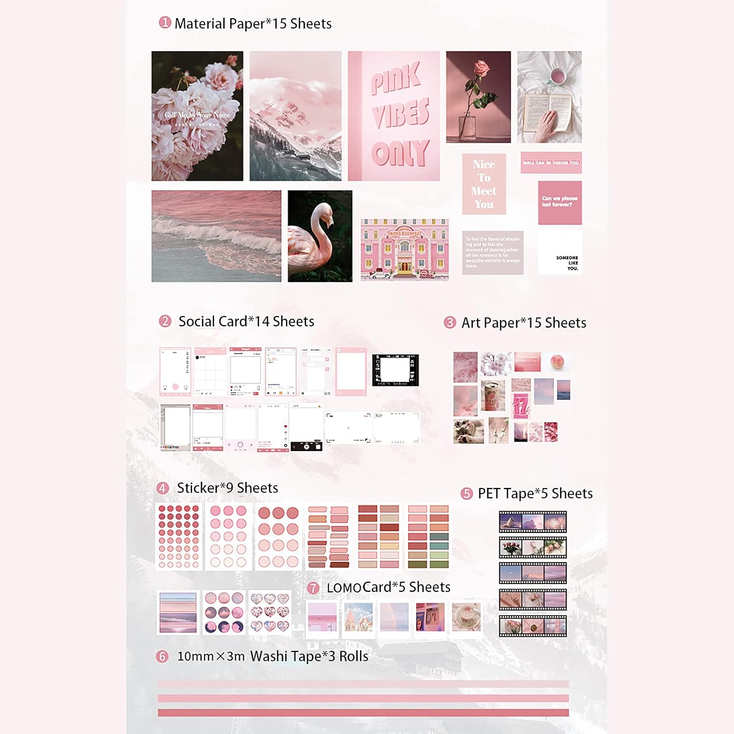 - Big Series: 64PCS material elements, including A4 size poster x 4, A5 size poster x 4, coated paper stickers x 15 sheets, LOMO card x 5, PET transparent tapes x 5, mini coated stickers x 9 sheets, letter papers x 5pcs, washi tapes x 3 rolls, writable social cards x 14pcs. A really big series material for decoration.