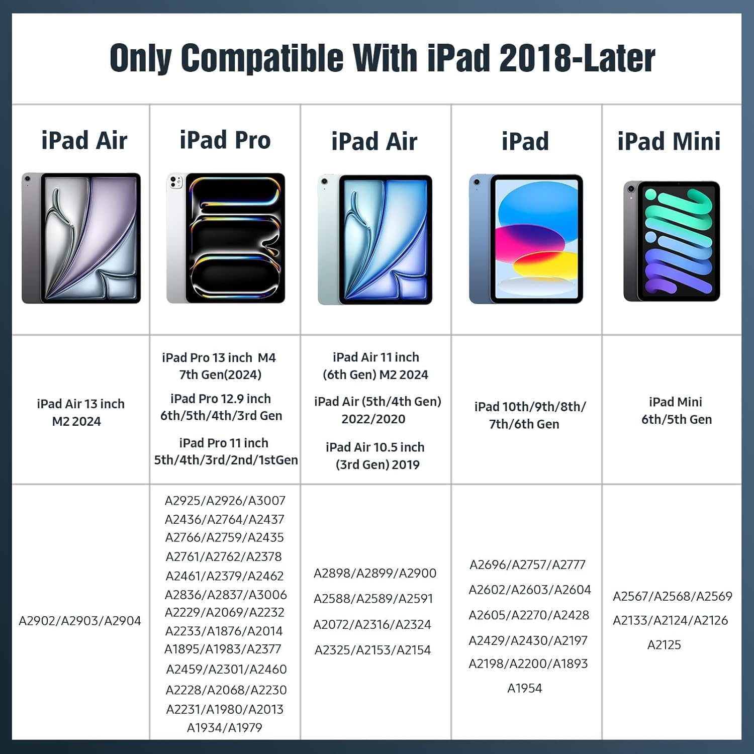 - Compatible Model: This ipad stylus is ONLY compatible with ipads released in 2018 or Later: iPad (2025/2022/2021/2020/2019/2018, 11th/10th/9th/8th/7th/6th gen), iPad Air 13" /11" M3 2025, iPad Air 13"/11" M2 2024, iPad Air 5th/4th Gen, iPad Mini (2024/2021/2019, A17 Pro/7th/6th/5th gen), iPad Pro 12.9 inch (2022/2021/2020/2018, 6th/5th/4th/3rd gen), iPad Pro 11 inch (2022/2021/2020/2018, 4th/3rd/2nd/1st gen), iPad Pro 13 inch (M4) 2024.