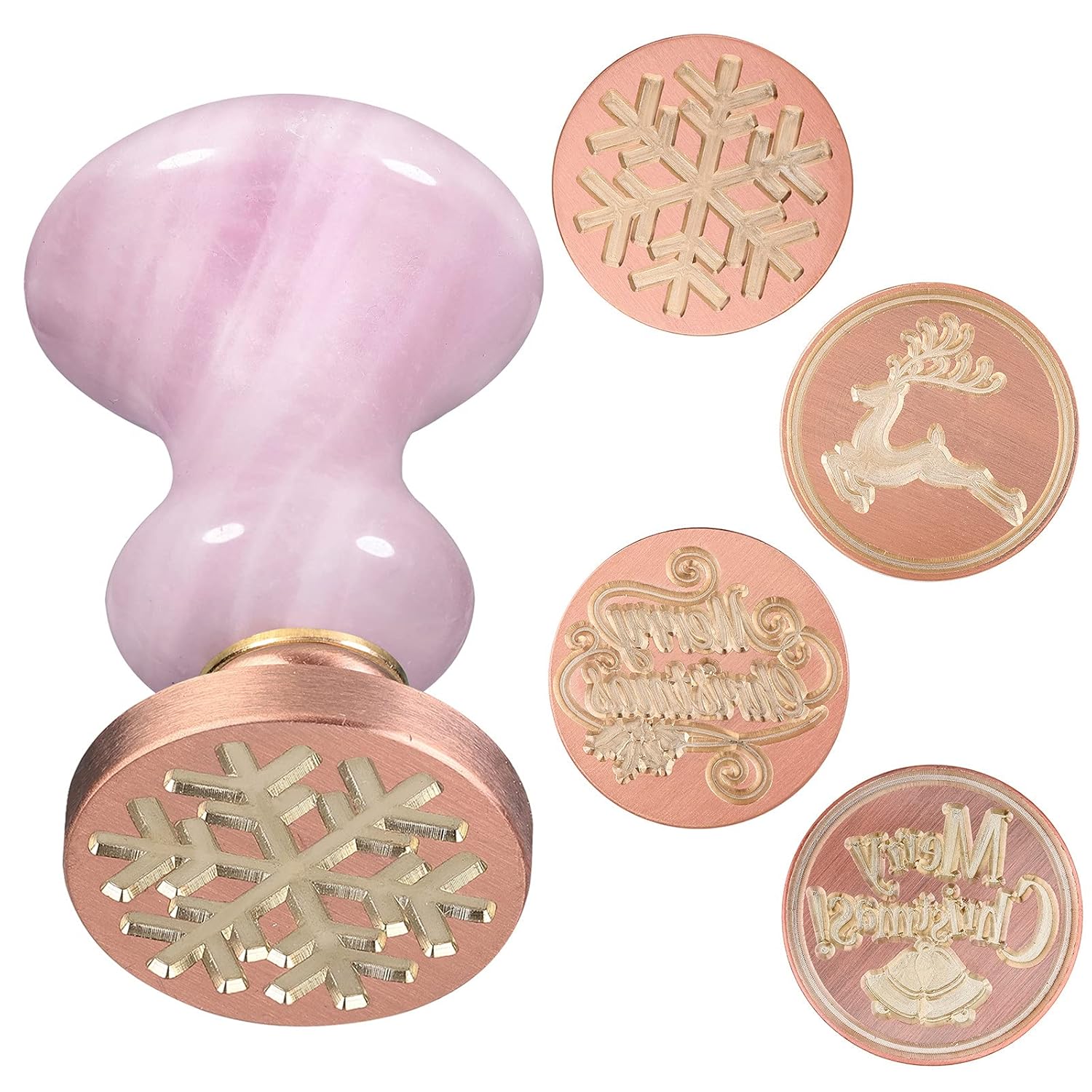 Rockcloud Wax Seal Stamps, 4 Pieces Copper Seals with Rose Quartz Handle, Christmas Theme, Pink