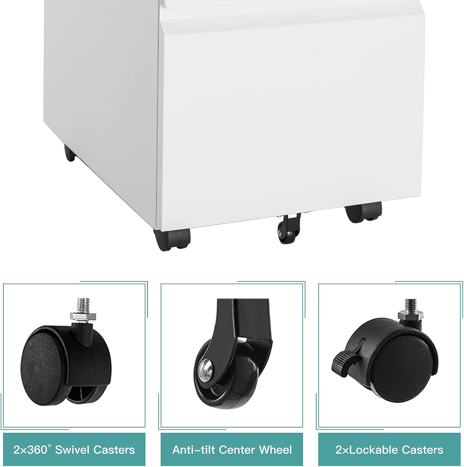 - 【Rolling File Cabinet 】: Equipped with 2 lockable casters + 2 x 360° swivel casters + 1x anti-tilt wheel, you can move it easily and safely. 360° swivel casters go to any direction easily, while lockable casters offer braking and the center support wheel prevents tipping.