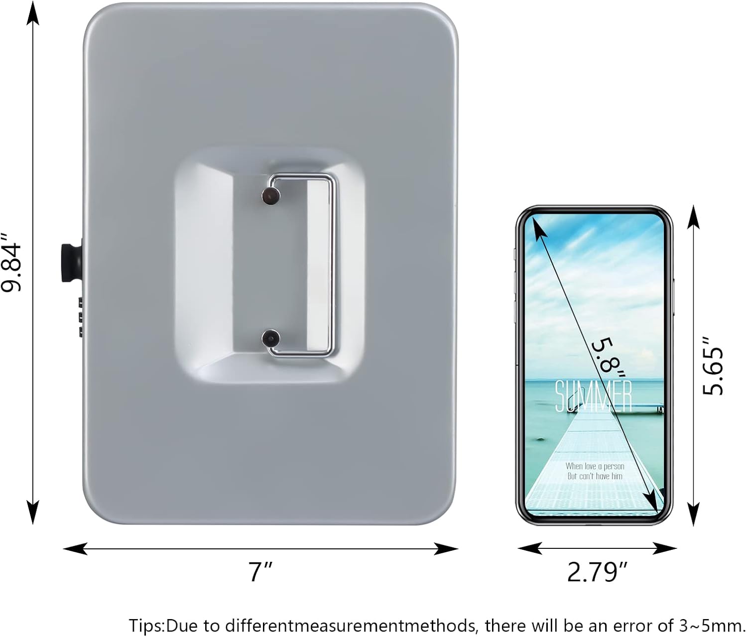 - SIZE AND COLOR: The size of the money safe box is 9.84"x 7"x 3.54" (250*180*90mm), and the color is Lightgrey , a very bright color.