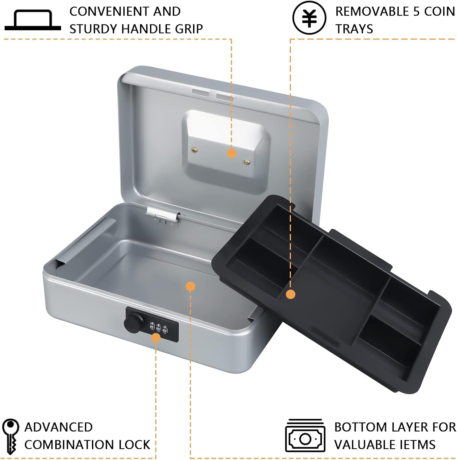 - REMOVABLE MONEY TRAY: The inner cash tray of the storage box is made up with five compartments, so your cash, coins and keys are able to be accepted separately. Besides, there is huge space for you to take care of checks, receipts and valuables at the bottom of the box.