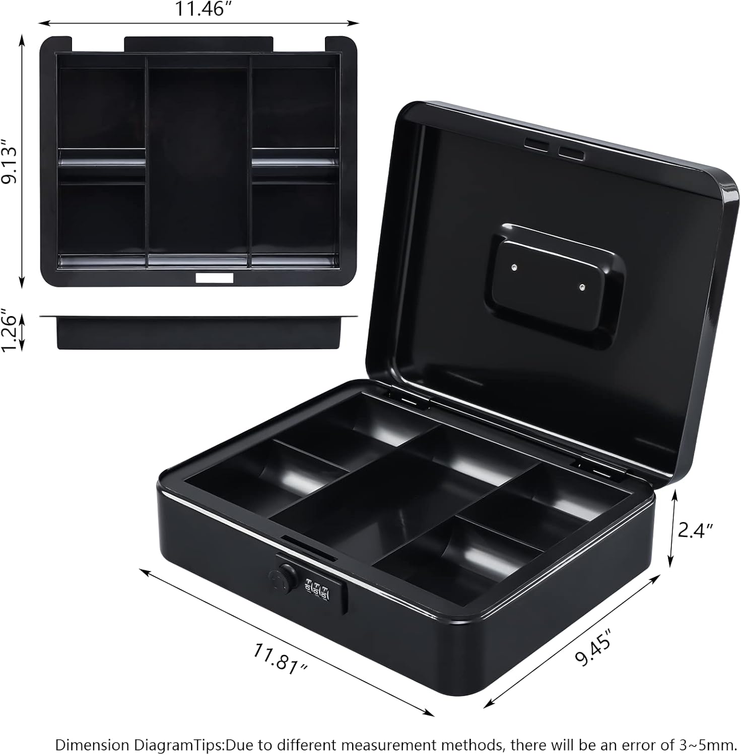 KYODOLED Metal Cash Box with Combination Lock Money Box for Cash Safe Metal Box with Money Tray for Security Lock Box 11.81"x 9.45"x 3.54" Black X Large