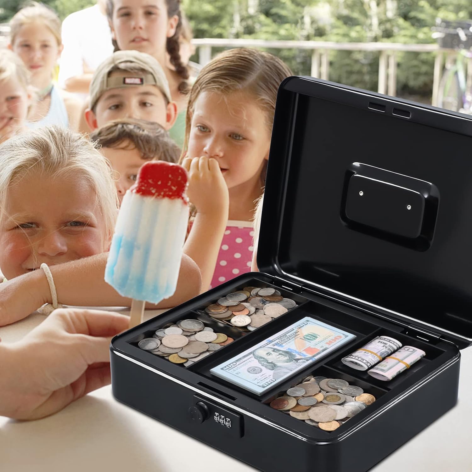 - REMOVABLE MONEY TRAY: The inner cash tray of the storage box is made up with five compartments, so your cash, coins and keys are able to be accepted separately. Besides, there is huge space for you to take care of checks, receipts and valuables at the bottom of the box.