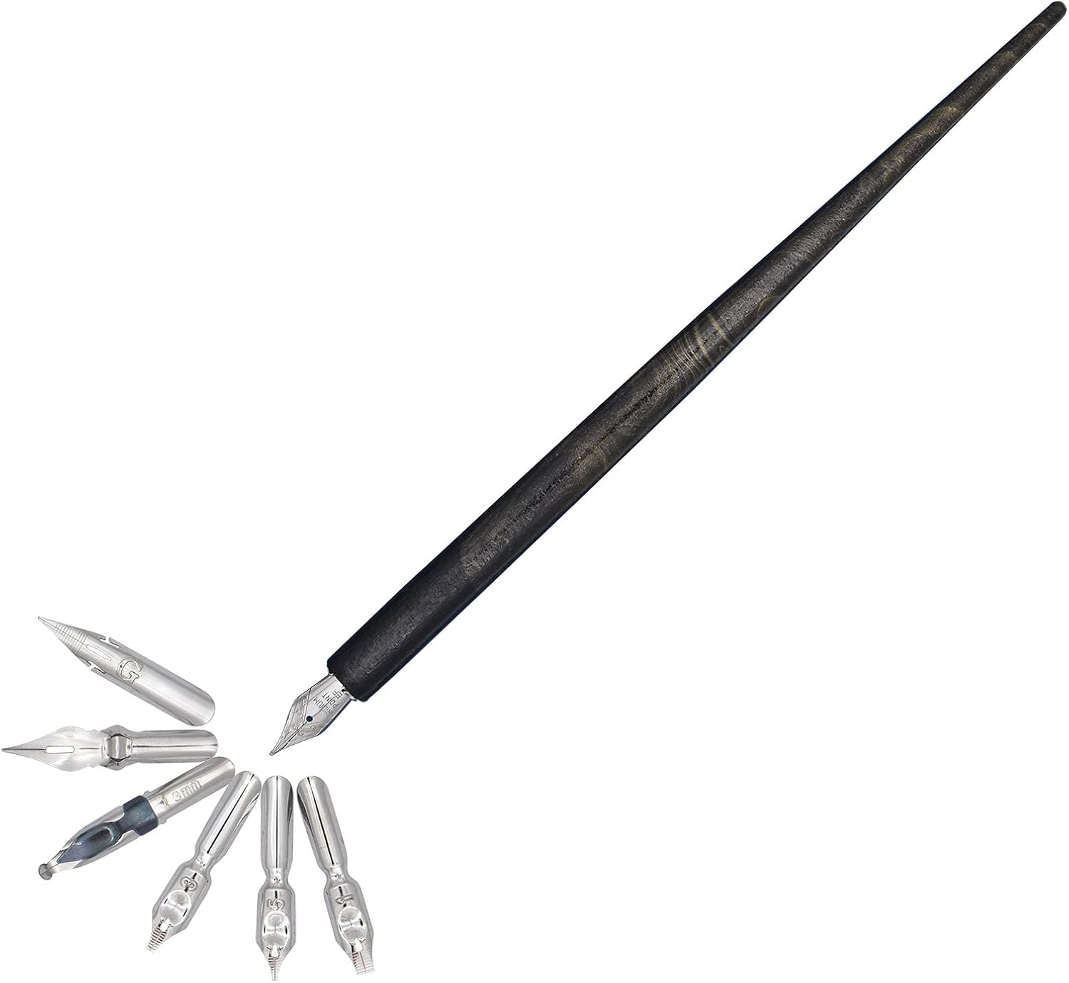 Gullor Wooden Dip Pen Calligraphy Set with Black Ink & 6 Nibs for Beginners, Kids, Writing, Signatures and Drawing, Black