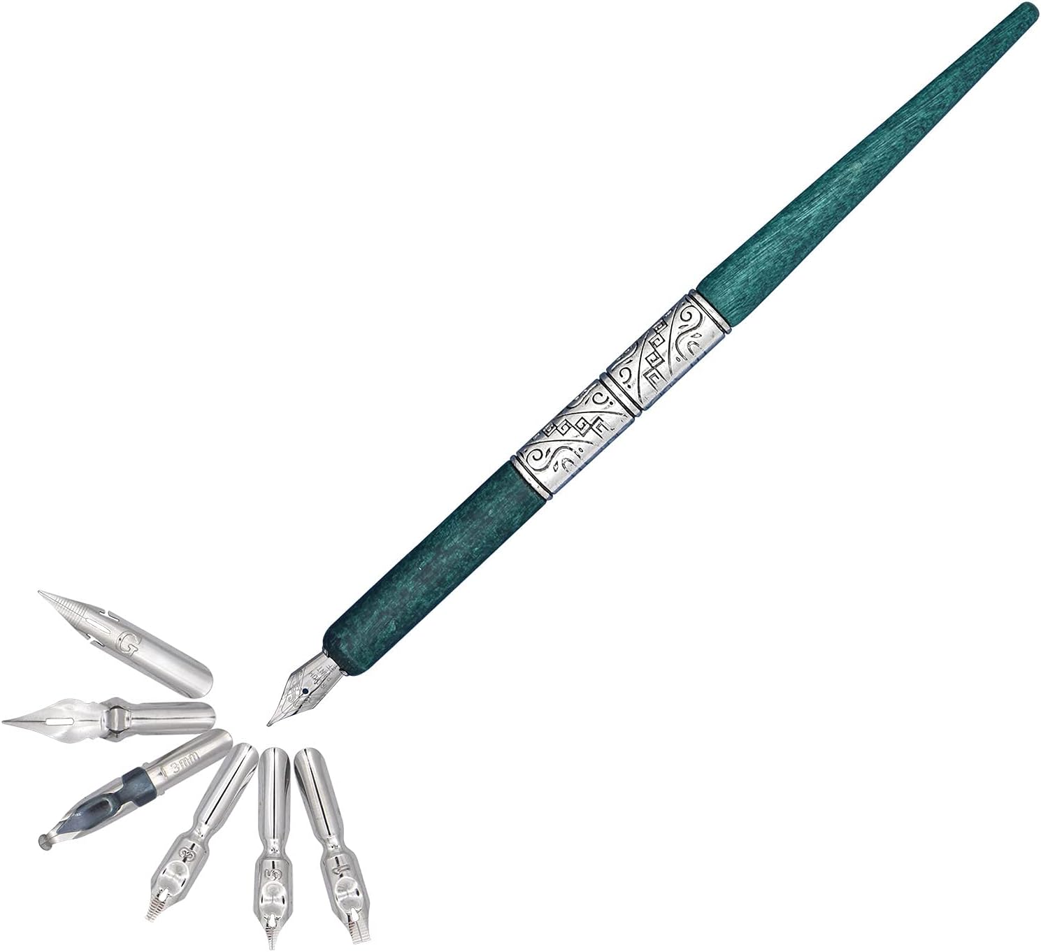 Gullor Wooden Dip Pen Calligraphy Set with Black Ink & 6 Nibs for Beginners, Kids, Writing, Signatures and Drawing, Ancient Silver