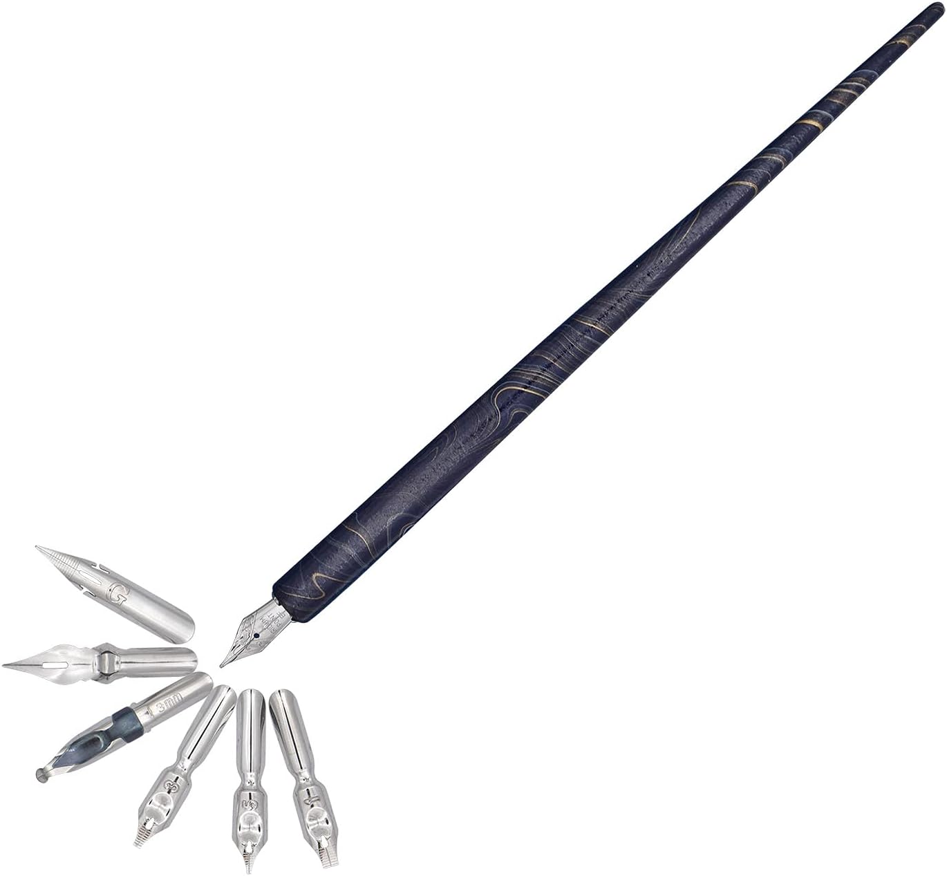 Gullor Wooden Dip Pen Calligraphy Set with Black Ink & 6 Nibs for Beginners, Kids, Writing, Signatures and Drawing, Blue