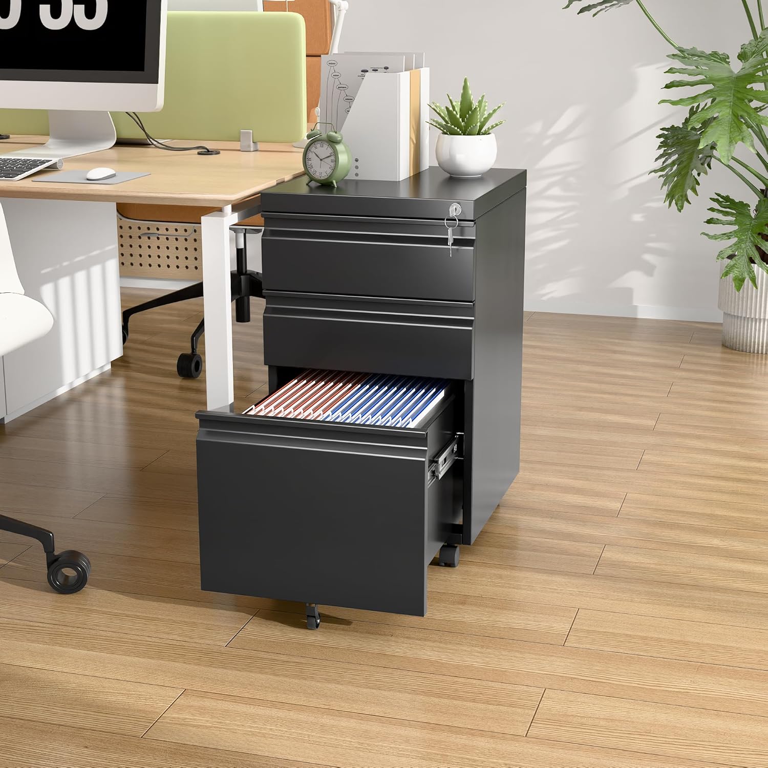 3 Drawer Under Desk Mobile File Cabinet with Lock, Metal Storage Cabinet for Office & Home, Legal/Letter Size, Fully Assembled Except Wheels, Black