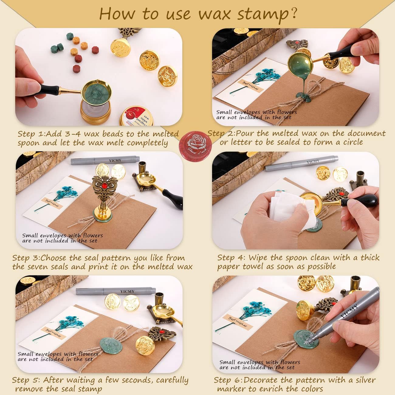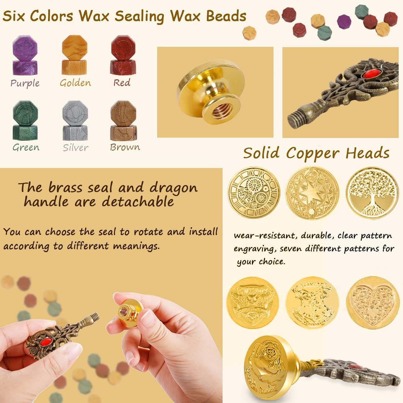 - Seven Seal Stamp Heads - The wax seal beads come in six different gorgeous colors. Only 2-3 wax seal beads are enough to form a perfect seal. You can match different colors of wax beads according to your creativity, and choose one from seven different seal stamp heads.And install on the handle to print a unique seal of your own. It is very suitable for making wedding invitations, party invitations, Christmas letters, greeting cards, and bring unlimited surprises to the recipients!