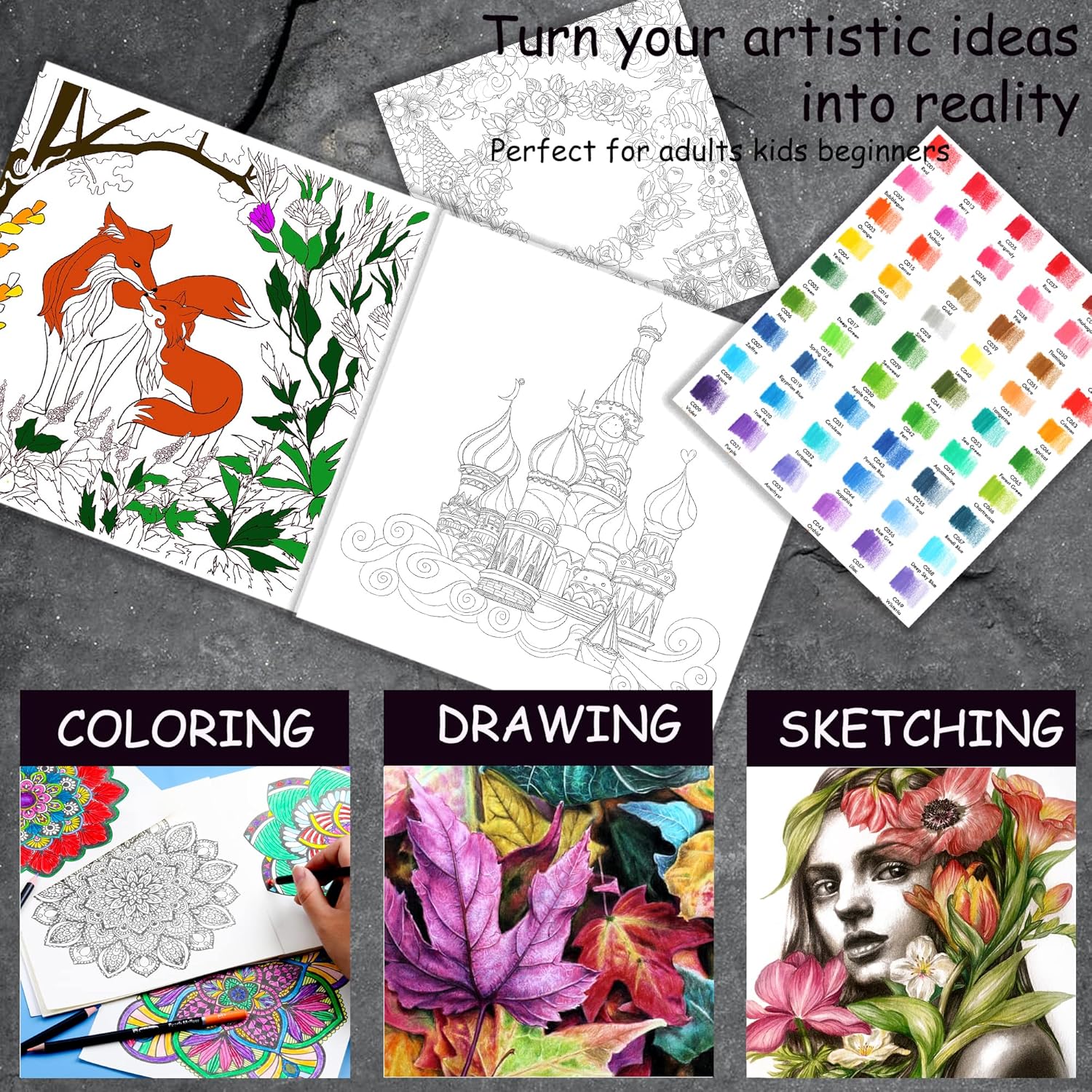 - 144PCS ARTISTS DRAWING SET - Set Including:120 professional colored pencils,12 sketching Pencil,3 charcoal Pencil, 1 woodless graphite Pencil,3 blending Stump, 1 metal sharpener, 1 vinyl Eraser, 1 pencil extender,1 sandpaper block, 1 sketching pad,1 coloring book,1 zipper travel case.