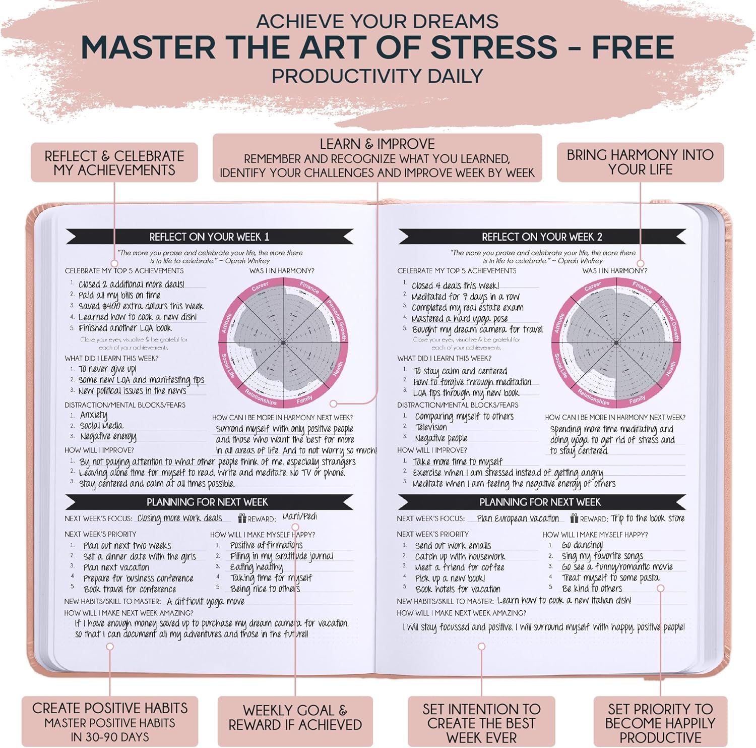 - LUXURIOUS AND TOP QUALITY - Self-care journal for women and men, perfect for entrepreneurs, professionals, college students and everyone who has burning desire to turn dreams into reality! FREE VIDEO MINI-COURSE: You will learn 10-min morning routine used by the most successful people to 10-fold your productivity, focus, happiness & passion! You will master setting goals & fix procrastination!