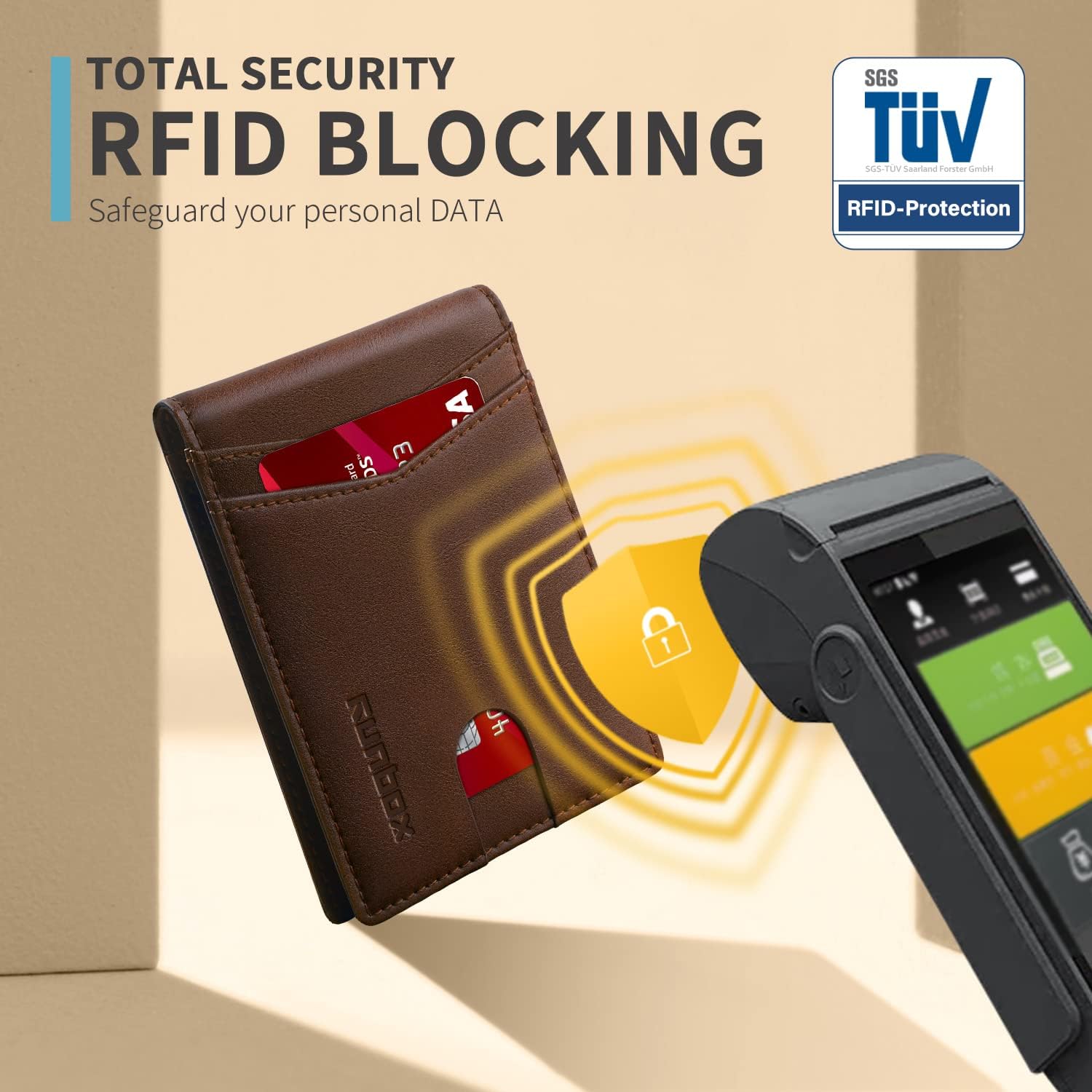 • RFID blocking- Our wallets are equipped with advanced RFID SECURE Technology, a unique metal composite, engineered specifically to block 13.56 MHz or higher RFID signals and protect the valuable information stored on RFID chips from unauthorized scans. License and ID cards will be protected effectively. Blocking the 13.56 MHz band and protect against data theft by RFID scanners.