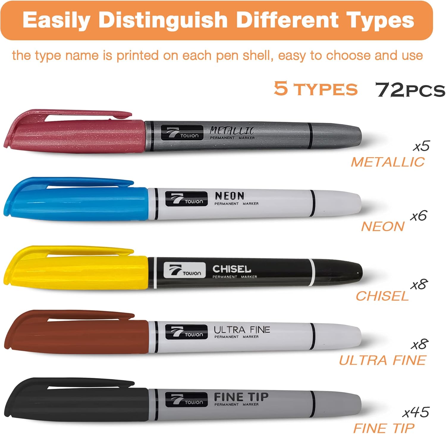 Permanent Markers 72 Assorted Colors - Waterproof Colored Pens Set 45 Fine Tip, 8 Ultra Fine, 8 Chisel Tip, 6 Neon, 5 Metallic Markers Home Office School Supplies for Kids, Adults Coloring