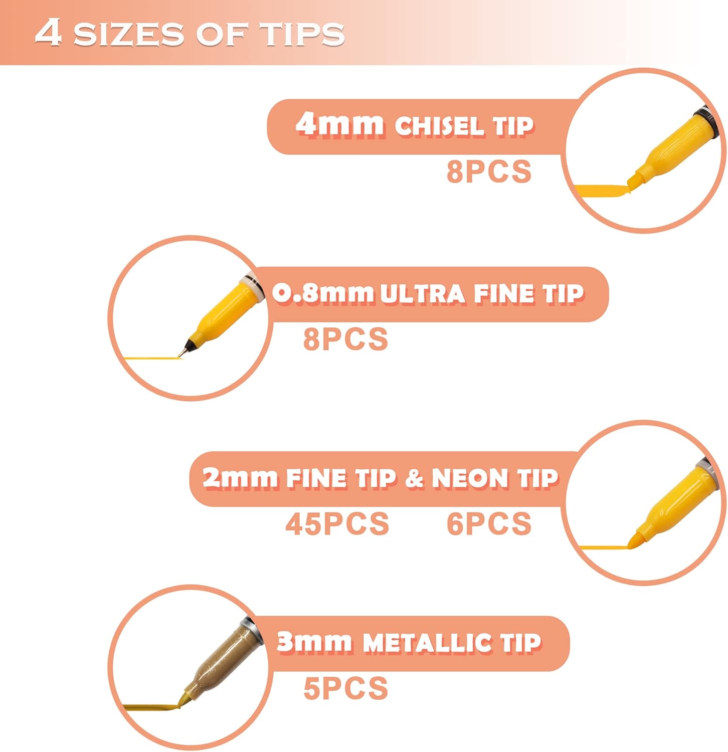 - 🖍️VERSATILE TIPS: Including 45 fine tip + 8 ultra fine point + 8 chisel tip + 6 neon + 5 metallic markers, a total of 5 tips, 72 multi-color pens. Fine and chisel tip can quickly color in large areas, and ultra fine point for sketch outlining to deliver precise details.