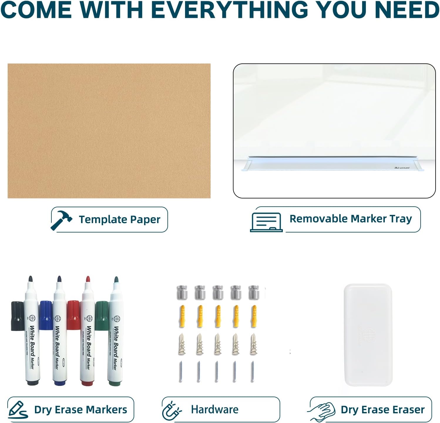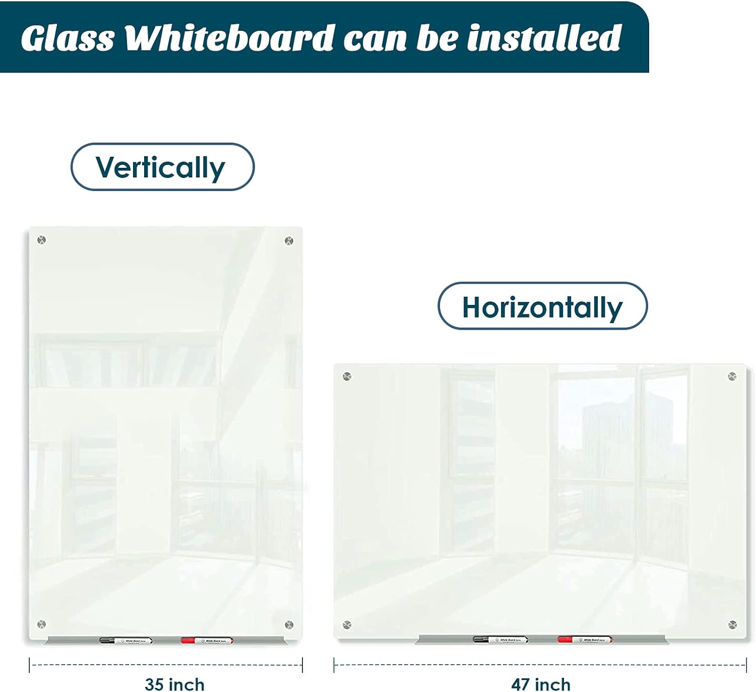 - 【ACCESSORIES INCLUDED】: 4 dry erase markers, 4 magnets, 1 glass whiteboard eraser, 1 removable aluminum marker tray, 1 template paper for mounting. One-stop shopping. t's a great gift idea for your workmate, boss or spouse which can enhance the office/ house atmosphere