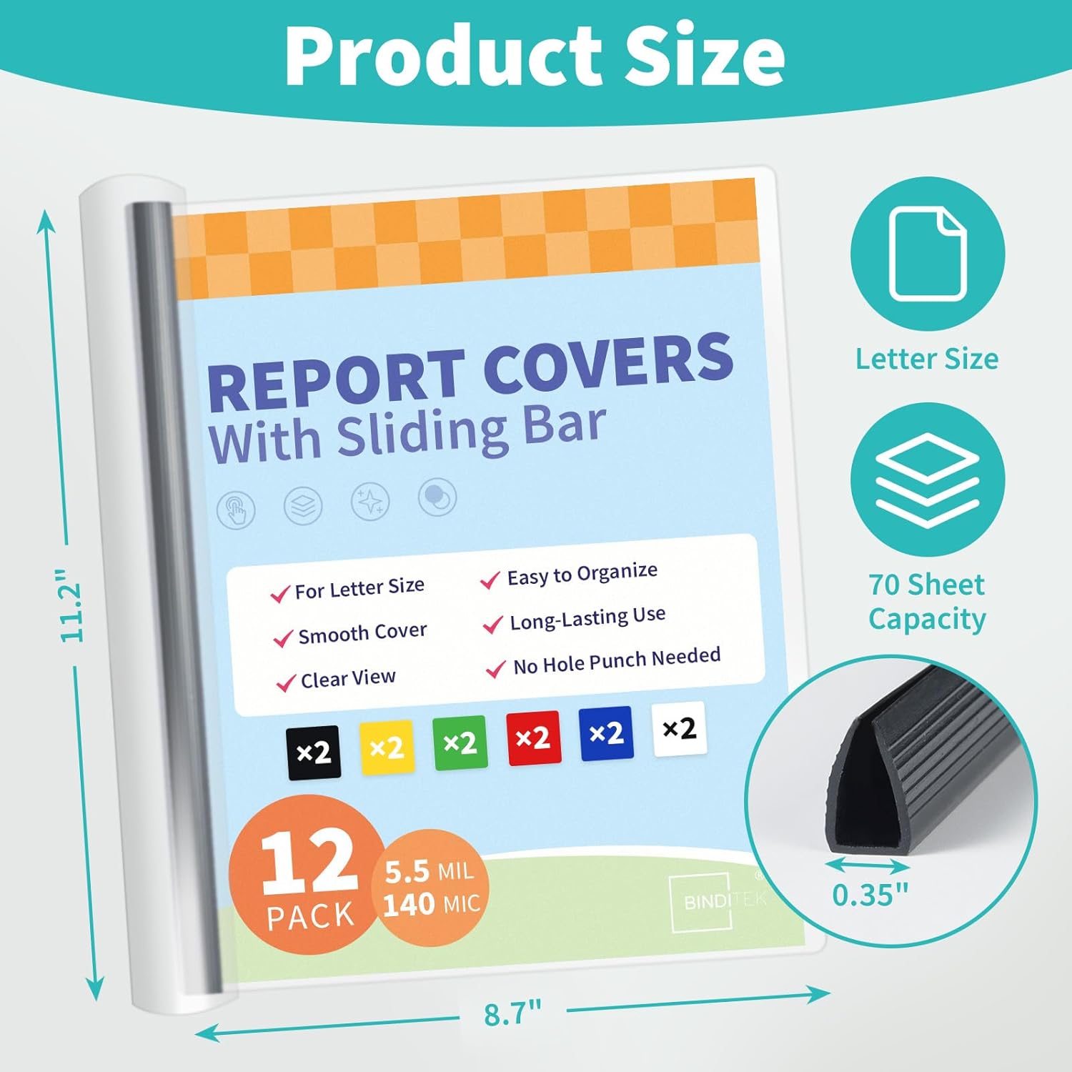 - 【12 Pack for Letter-Size】 This set includes 12 clear report covers and 12 multicolor sliding bars, with 2 of each color—White, Yellow, Red, Green, Navy, and Black—designed to fit standard letter-size paper (8.5 x 11 inches). The transparent front cover enhances the professional appearance, while the secure sliding bar keeps documents neatly in place. UL-certified for quality and reliability, these covers are built for frequent use and dependable document protection.