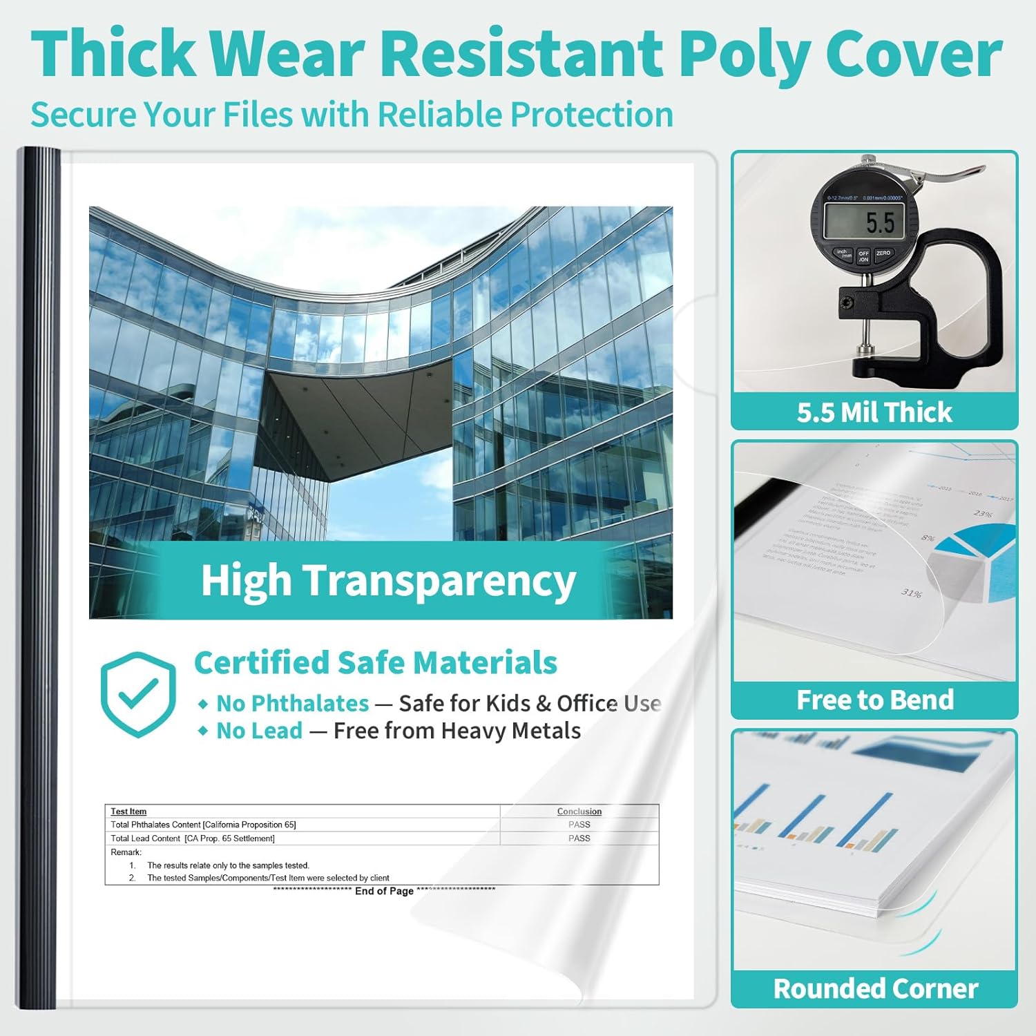 - 【70 Sheet Capacity】 The 9 mm sliding bar holds up to 70 sheets of 20 lb paper, offering a compact and practical solution for daily document organization. The 5.5 mil (140 mic) clear cover resists bending, tearing, and moisture, keeping files in good condition. Rounded corners offer a smooth touch and help prevent paper damage. Lightweight and portable, suitable for quick presentations and reports.