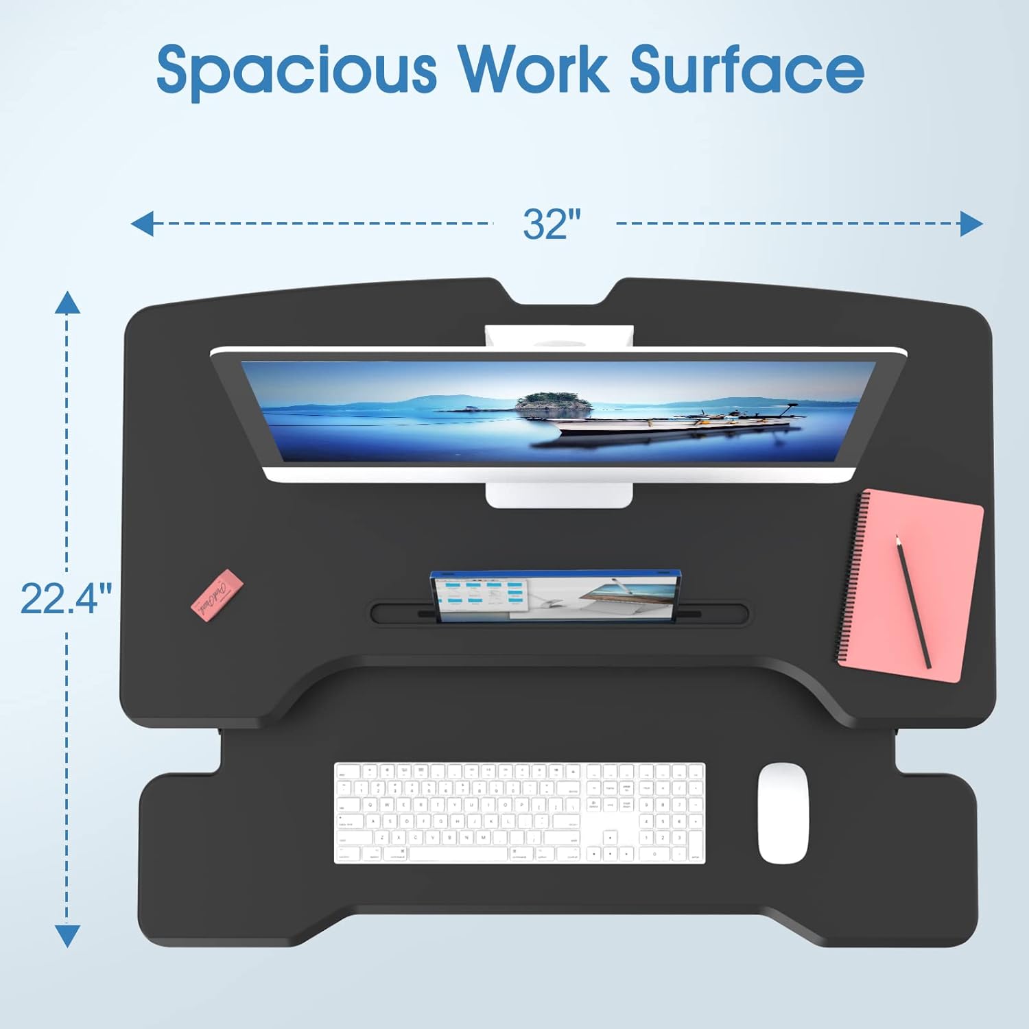 - Double Layer Office Space: This adjustable standing desk with an 32''×15.7'' desktop has enough space for all of your gadgets, And an oversized keyboard tray that accommodates flexible setup options like a 17-inch laptop or a keyboard and mouse