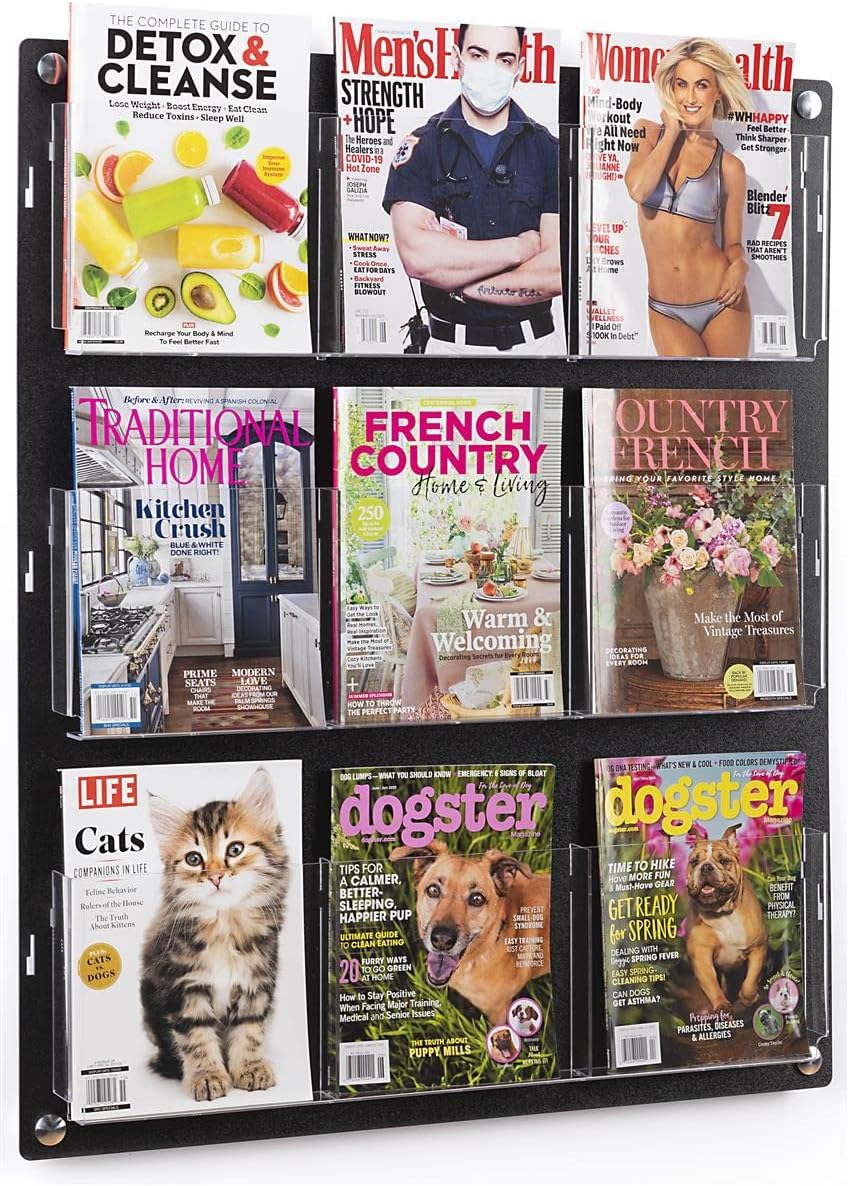 Displays2go Wall Mount Acrylic Brochure Holder, 9-18 Adjustable Pockets, Tiered Design - Black (2RP9BLK)