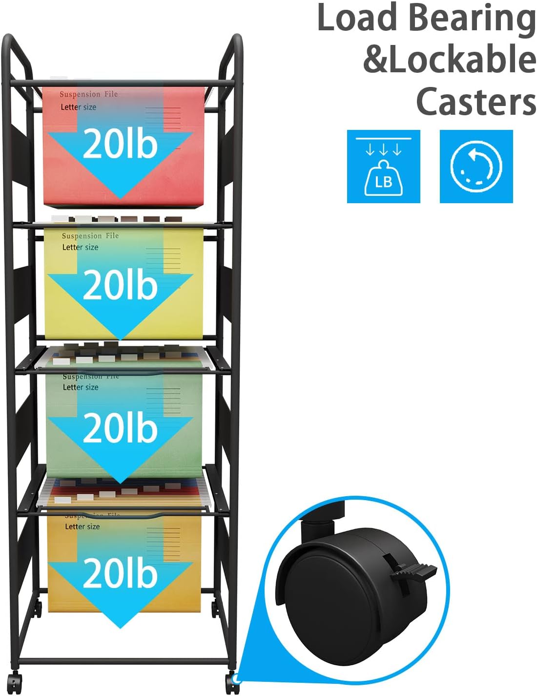 - 【Caster Wheels】With four lockable wheels, the hanging folder cart can be moved everywhere you want in home or office. Also the 360° swivel wheels ensure smooth transportation, and the lockable design help keep stability in one place.