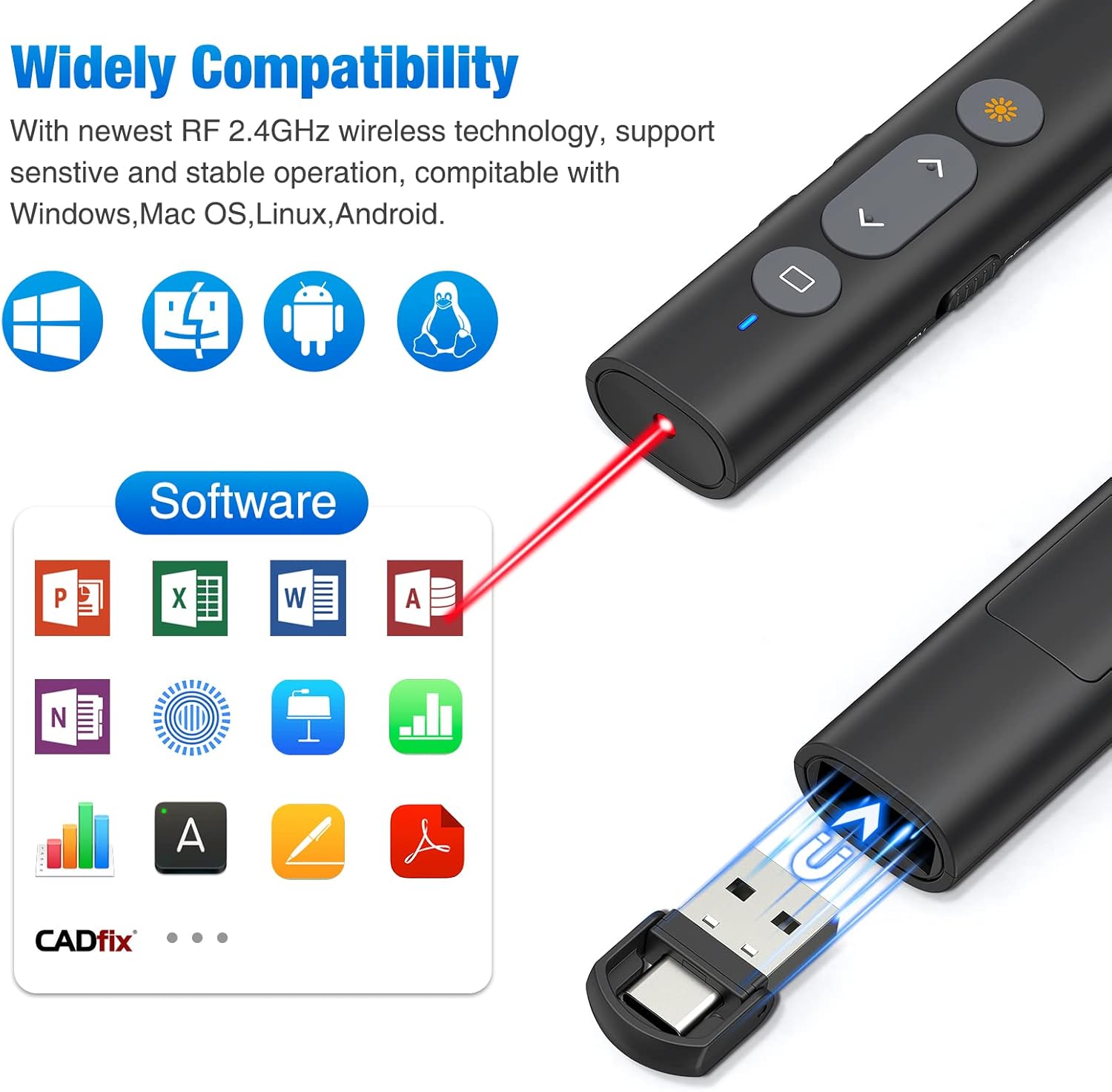 - 【2 IN 1 USB and Type C receiver for Presentation】Come with a unique dual-head design, USB & TYPE-C can meet all your need. There is a magnetic slot for storage this receiver, very reliable for your presentations