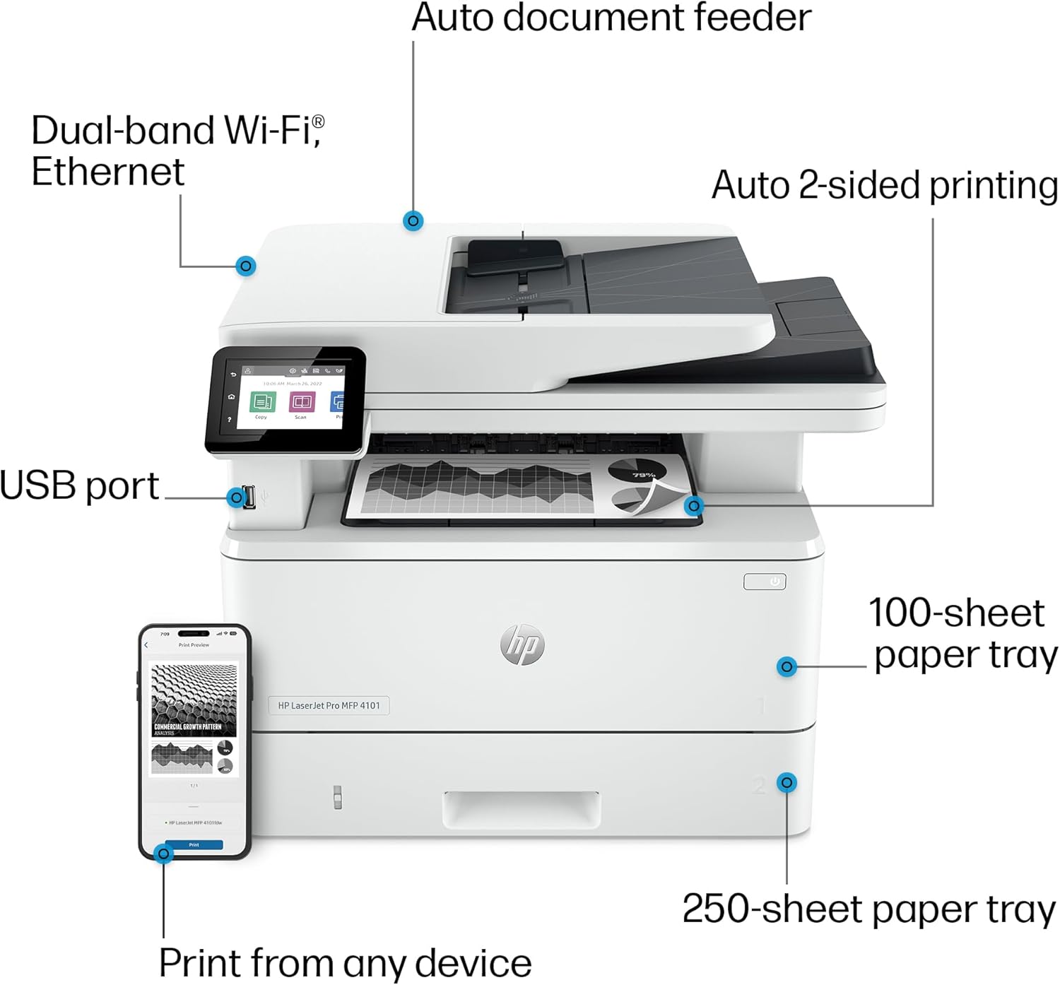 HP LaserJet Pro MFP 4101fdw Wireless Black & White All-in-One Laser Printer, Scanner, Copier, Fax, Best-for-Office (2Z619F)