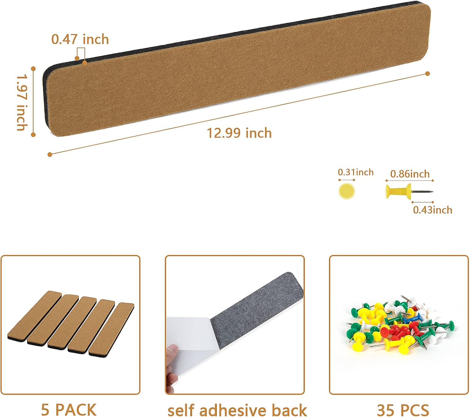 - 【Premium quality】 : Featured with superior felt material and adhesive design allows you to use the board strip more simple without drill hole. 12.99 x 1.97 inch for each boards and 35 push pins can meet your daily use.