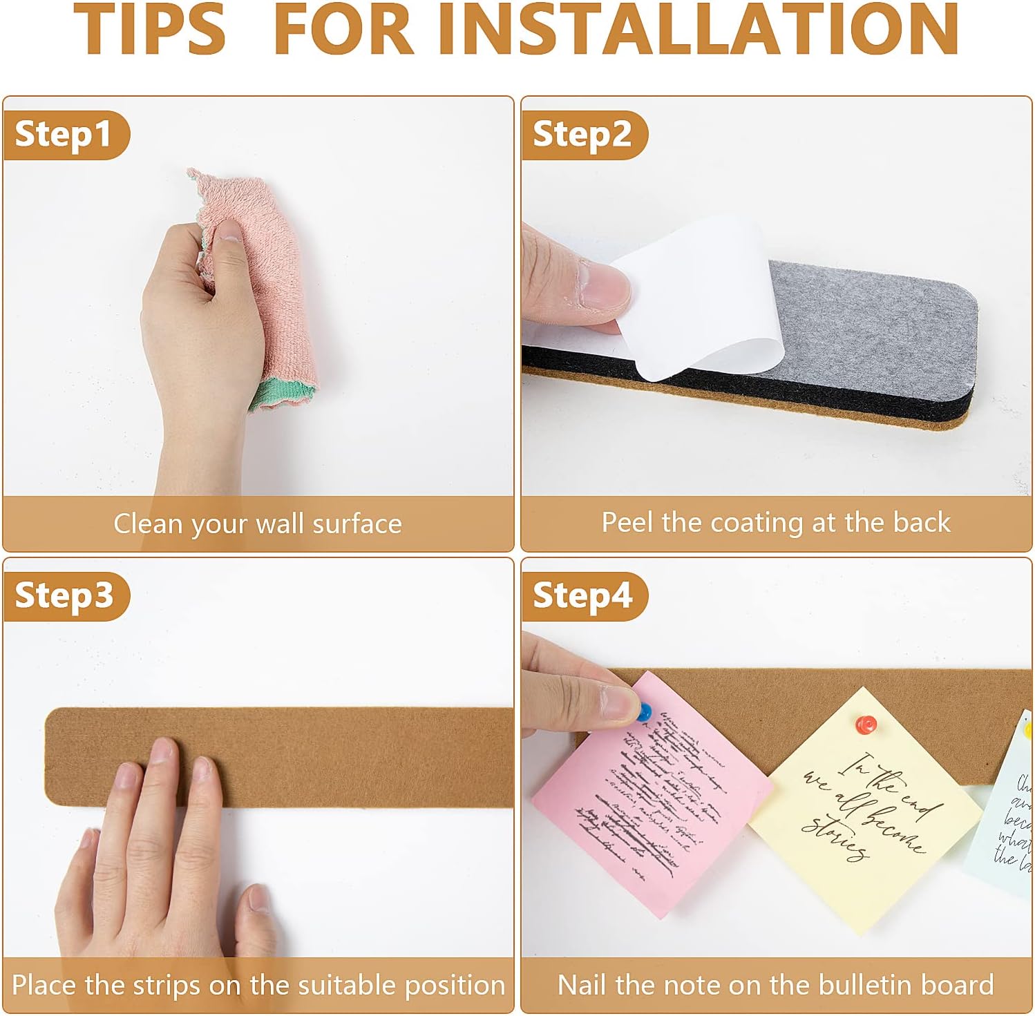 - 【Warm Tips】: Please make sure the surface is thoroughly dry and clean before applying the pin board.The length of the needle is shorter than the thickness of felt strip, won’t protrude from the wall.