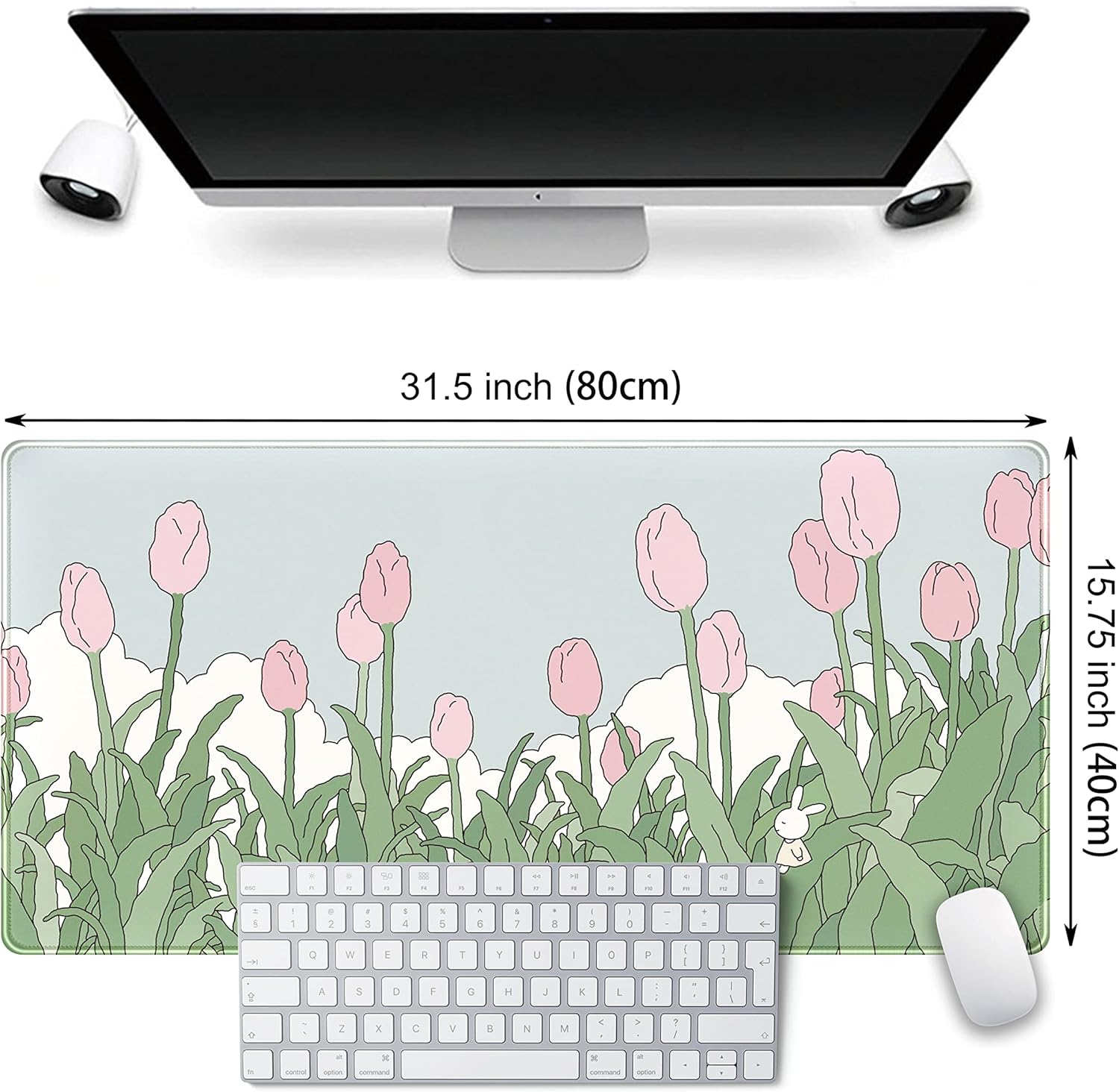 WatercolorTulip Flower Mouse Pads,Extended Gaming Mousepad XXL Kawaii Anime Desk Mat Pink Green Large Full Desk Mouse Pad for Wireless Mouse Keyboard Mat with Stitched Edges 31.5" x15.75