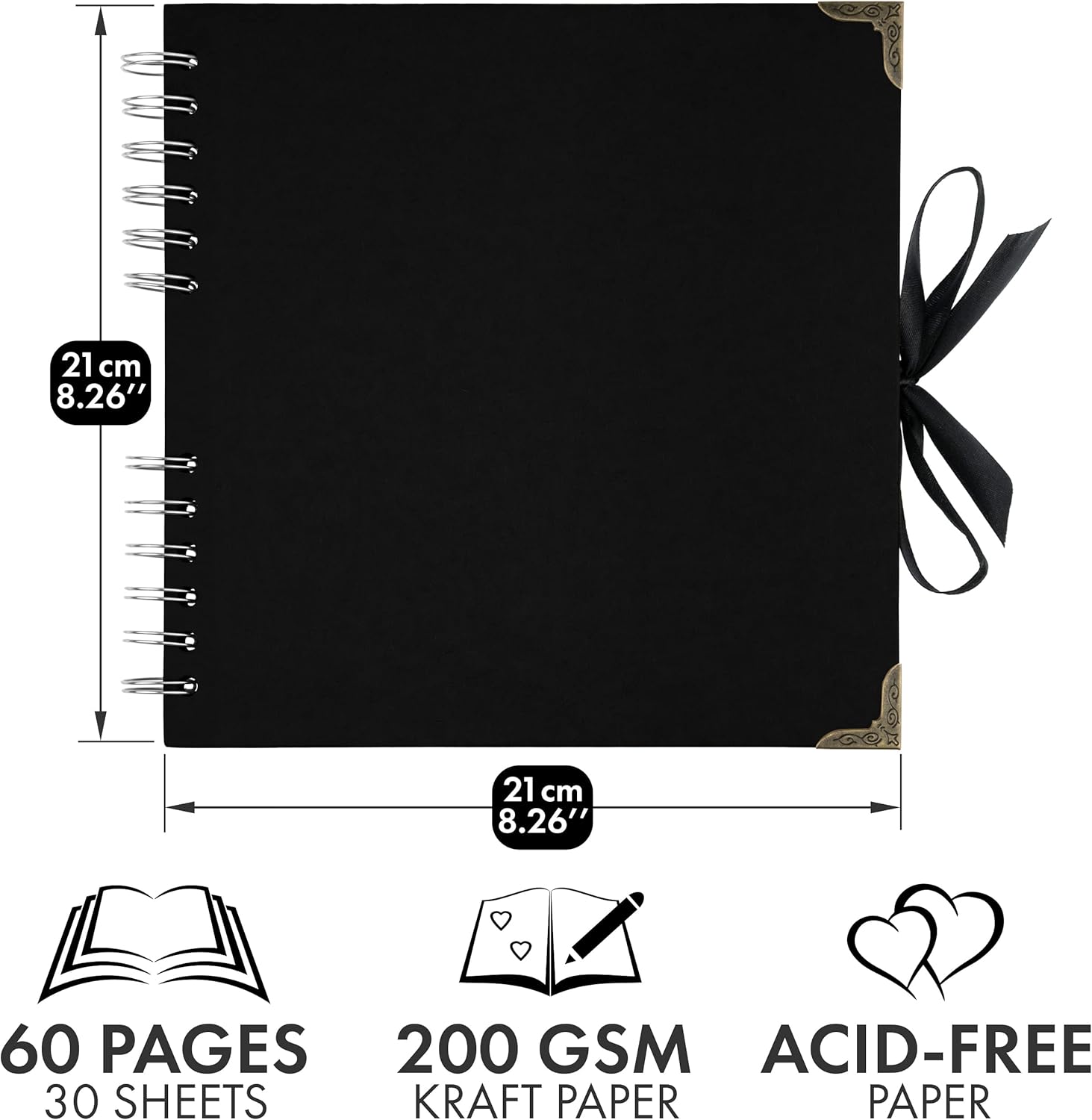 Bstorify Scrapbook Album 60 Pages (8 x 8 inch) Black Thick 250gsm Kraft Paper, Corner Protectors - Scrap Book, Ribbon Closure - Ideal for Your Scrapbooking Albums, Art & Craft Project