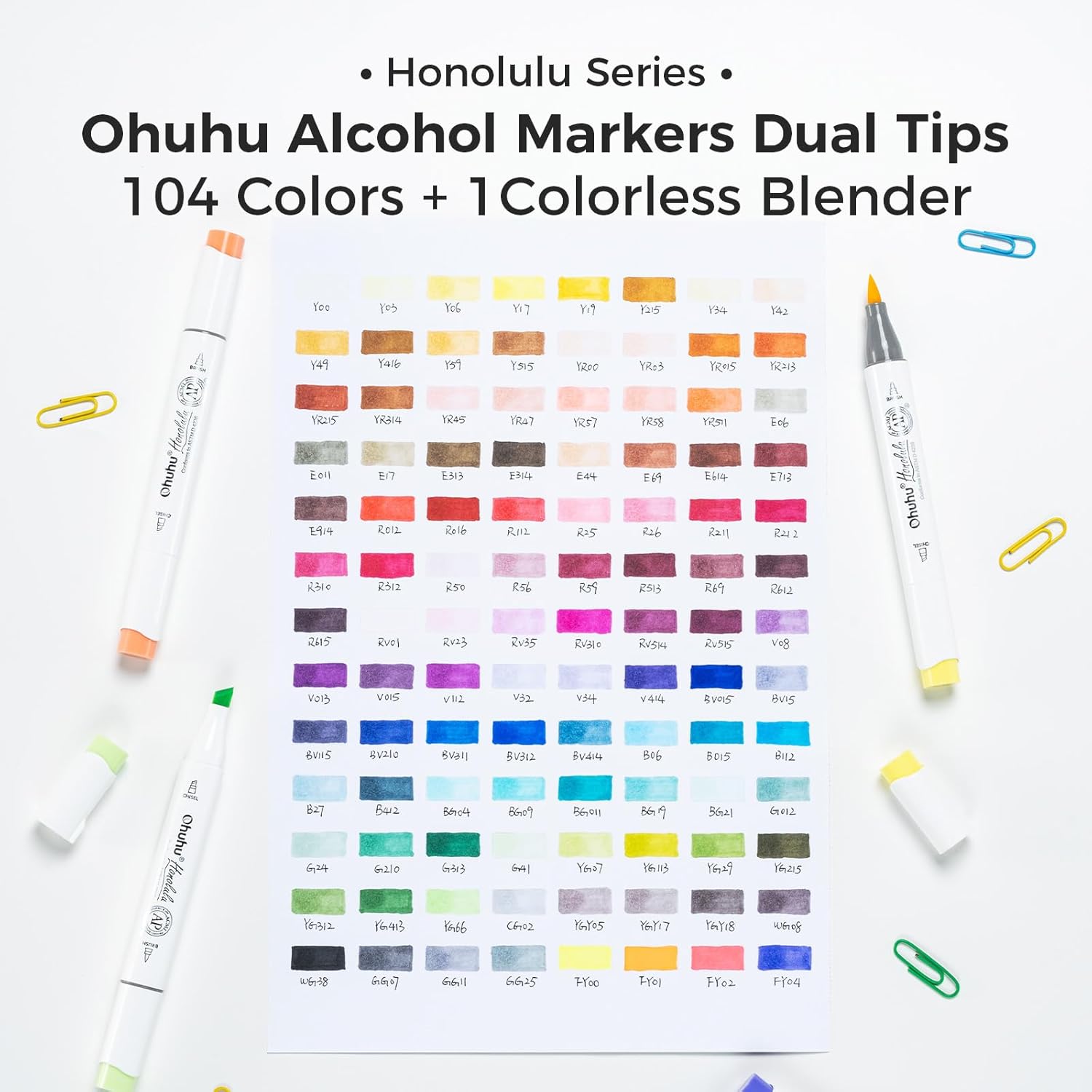 - 104-COLOR ART MARKER: If you already own the 216 colors set of Ohuhu Honolulu Series, it is suggested to purchase this New 104 colors set to expand your collections to 320 colors. The color spectrum is yours to explore with 104 brilliant shades to choose from, plus a colorless blender for better blending effects. From coloring books to professional masterpieces, our brush markers will breathe life into your artwork