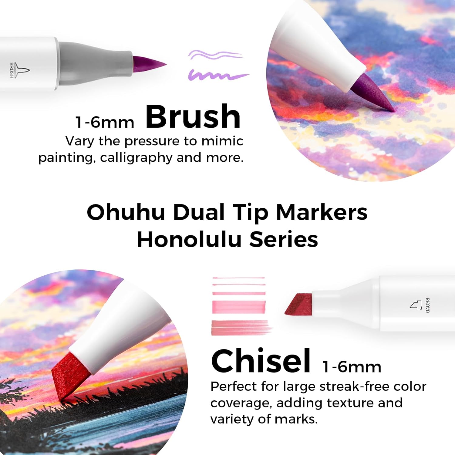 - BRUSH & CHISEL, DOUBLE-TIP, DOUBLE THE FUN: Widen your artistic horizons with the dual-tip marker design! Choose the brush tip for sweeping, calligraphic strokes or quickly color in large areas with the wide chisel tip. What's more, now Ohuhu replacement brush tips is available, so you can easily replace the worn-out tips to ensure consistent and precise lines whenever you create. The only limit is your imagination