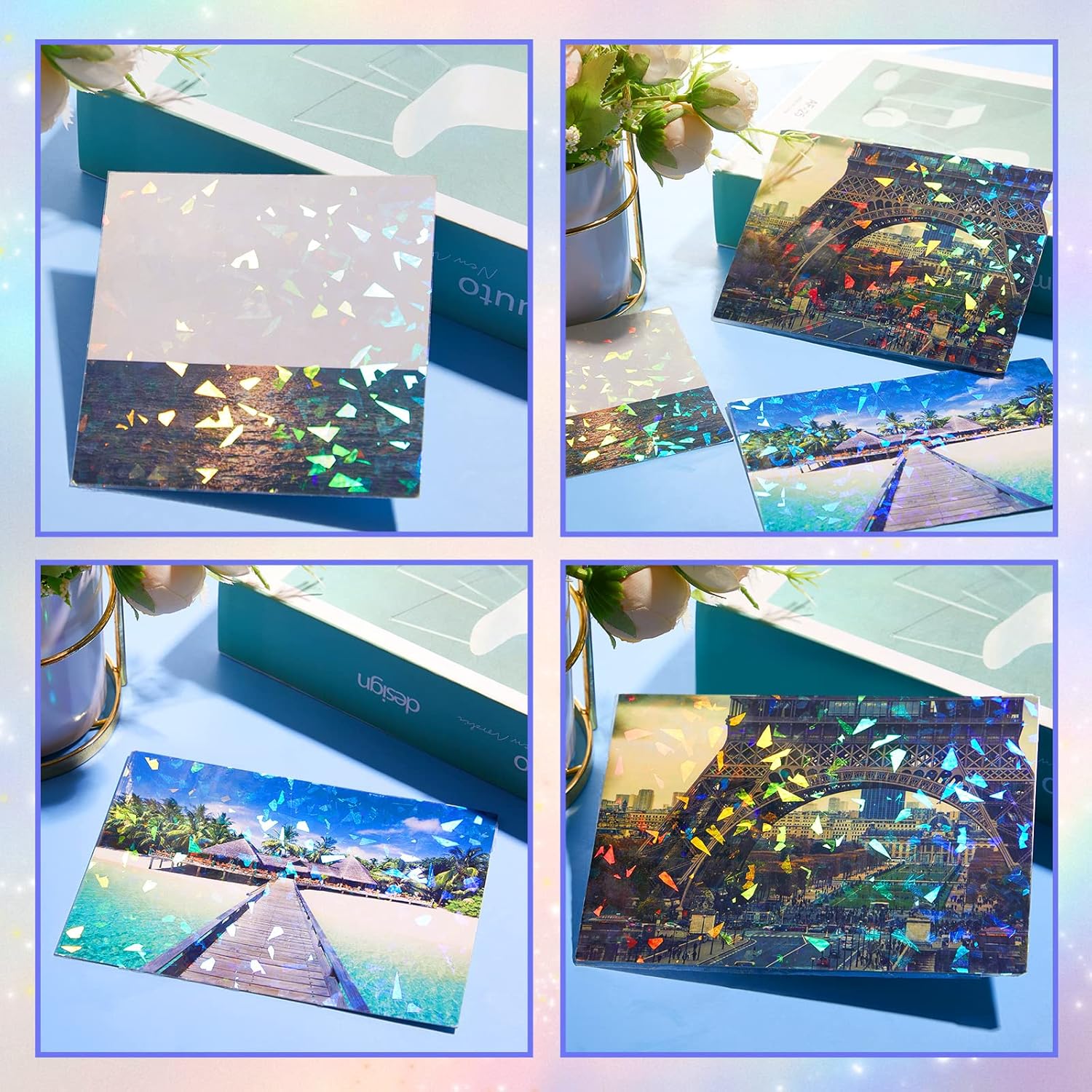 - Peel and Stick: these holographic laminate for stickers can be peeled off easily without leaving sticky residues, and they are yet adhesive enough to stick to the surfaces, making the application of these holographic sticker paper sheets more simple and fluent