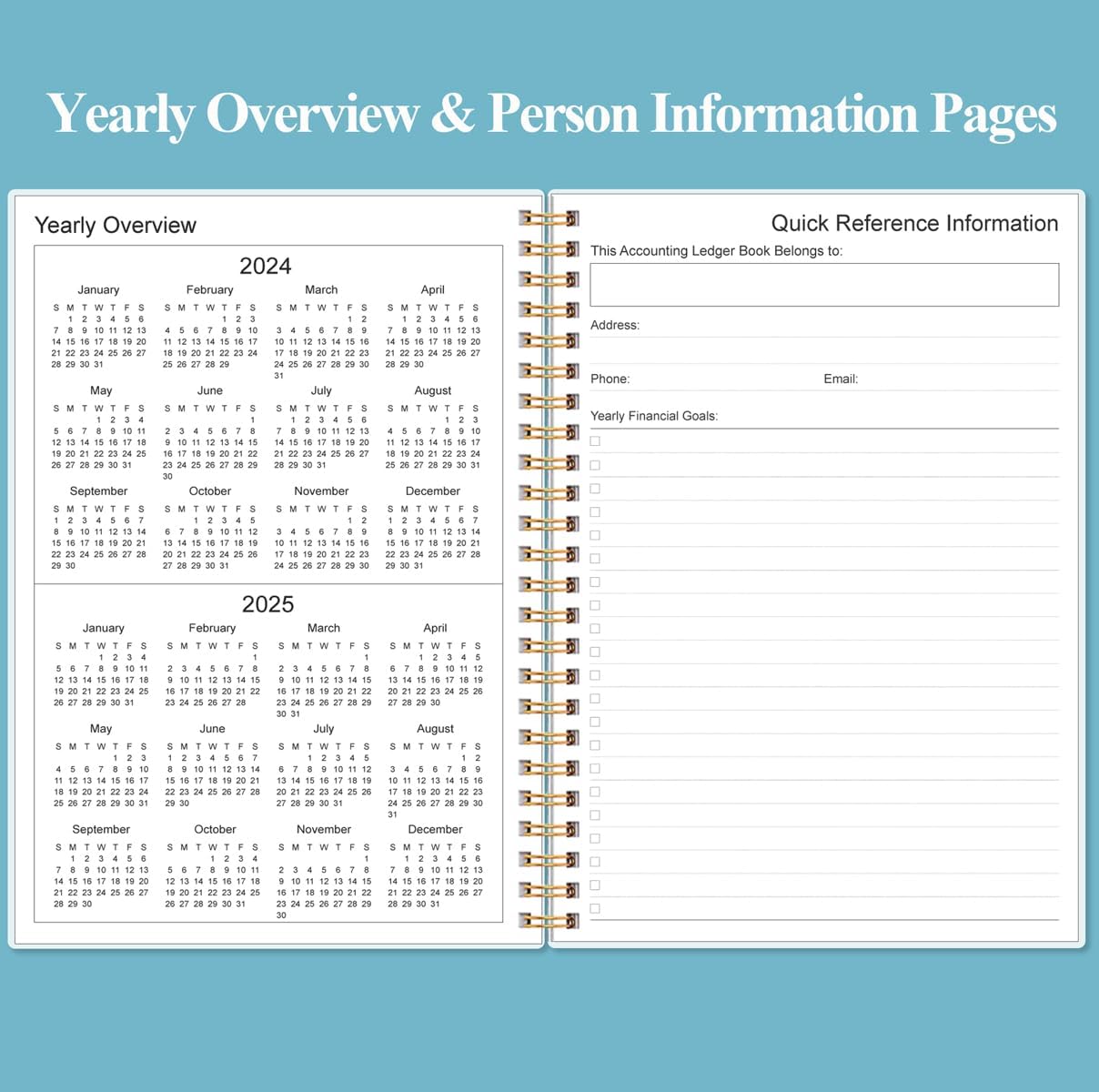 - HIGH QUALITY - The A5 expense tracker notebook is used to high quality 100gsm pure white paper, teal elastic band and a back pocket for extra space. A total of 64 sheets(128 pages), it comes with 3480 entry lines (29 lines per page, 60sheets/120pages), 1 page Year Overview, 7 lined notes pages. The accounting book is plenty of space to record each transaction you make, and state its number, date, description, account, payment or deposit amount, and total balance.