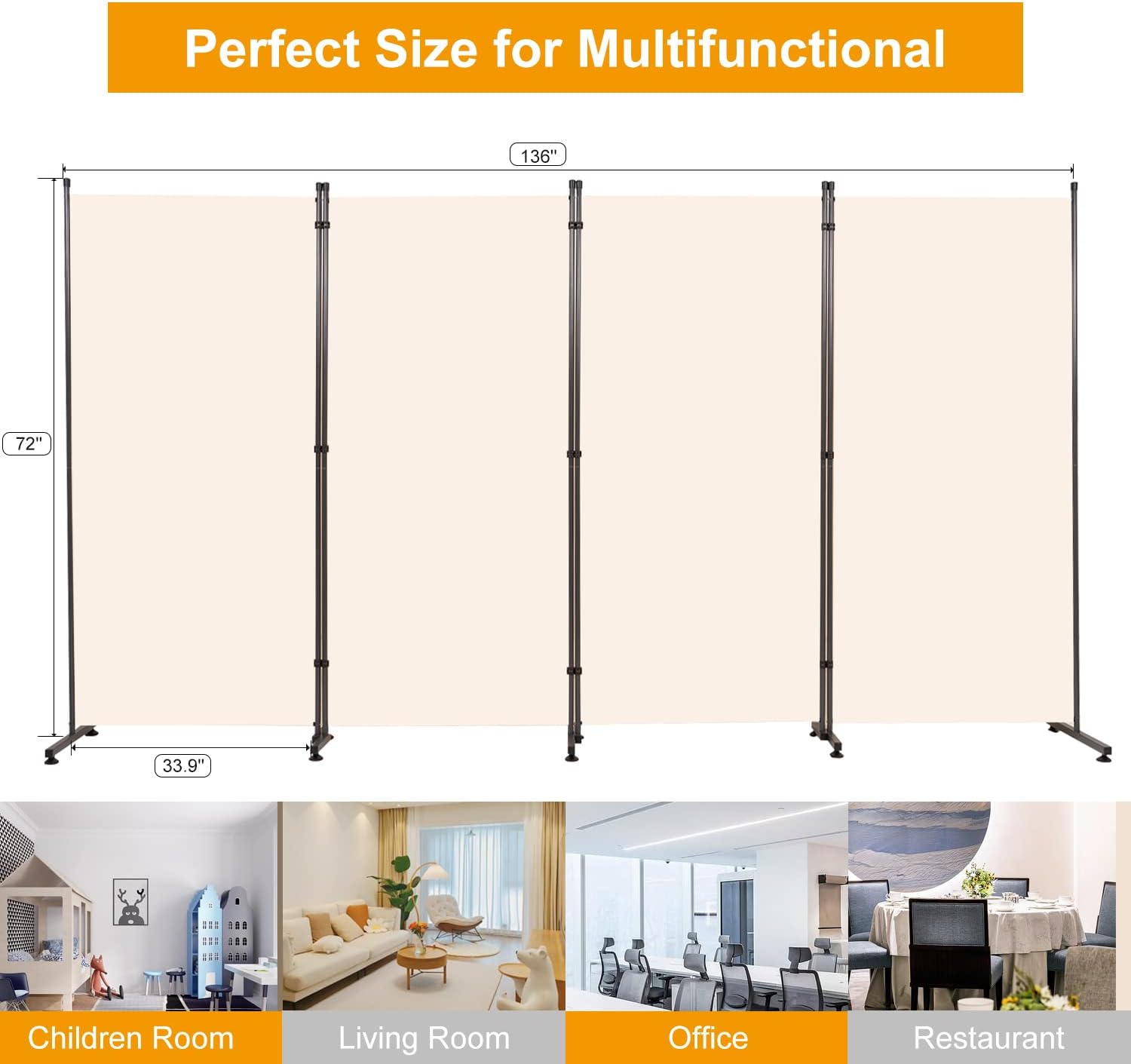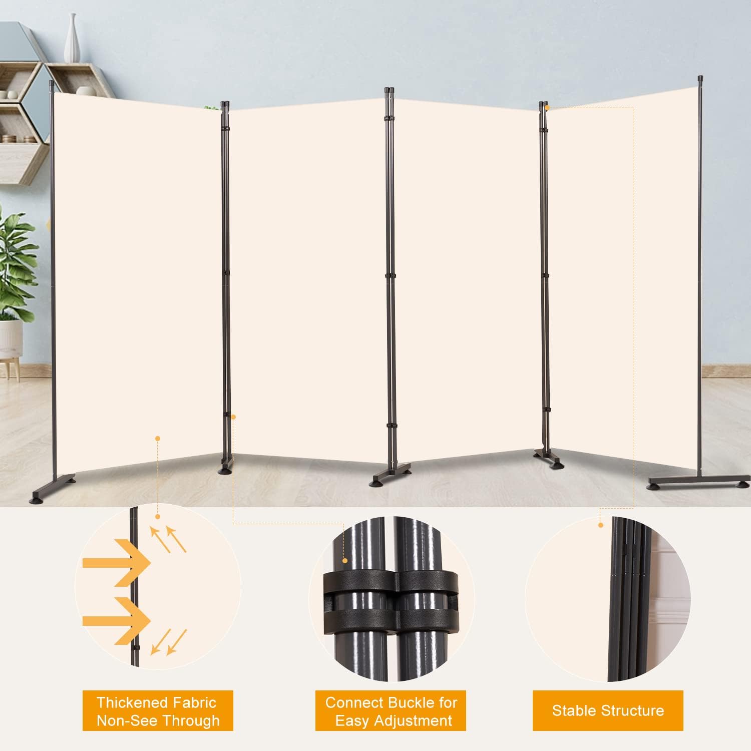 - Round Pad Room Divider: The Room Divider is flexible and easy to move, it's can be divided in to 1-4 panels to meet all kinds of scenes by installing or removing plastic connectors. The metal base with round pad fits better to the ground and provides better grip for a more stable stand. You can use our room dividers to separate bedroom, living room, dorm, garage, study, office, resturant, block strong light at the window, as well as work as zoom meeting background