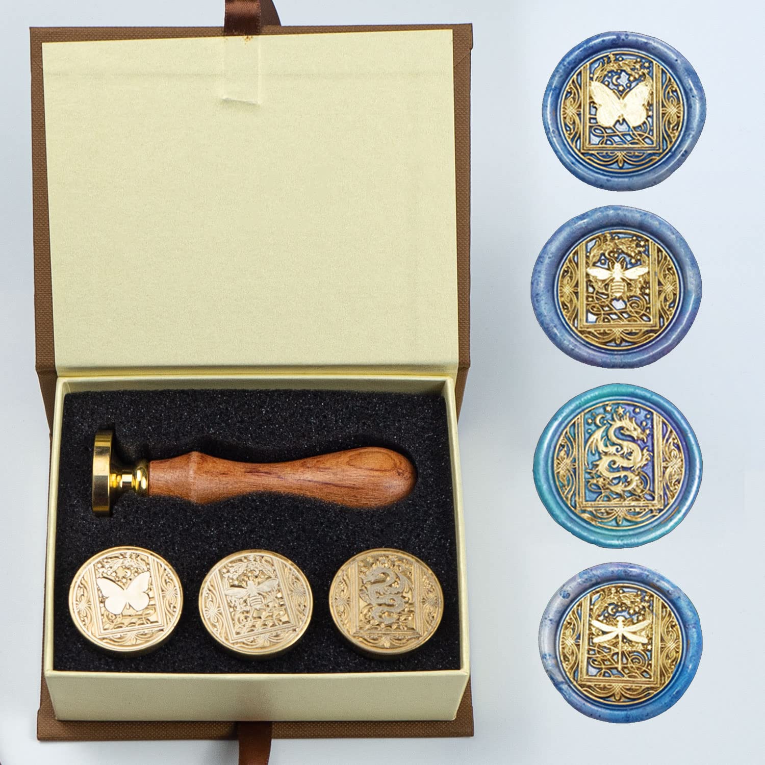 - [Package Includes] ANBOSE wax seal stamp kit includes 1 PCS Wooden handle,1 PCS Starry Butterfly wax seal stamp, 1 PCS Starry Dragonfly wax seal stamp, 1 PCS Starry Bee wax seal stamp, 1 PCS Starry Dragon wax seal stamp and 1 Gift box.