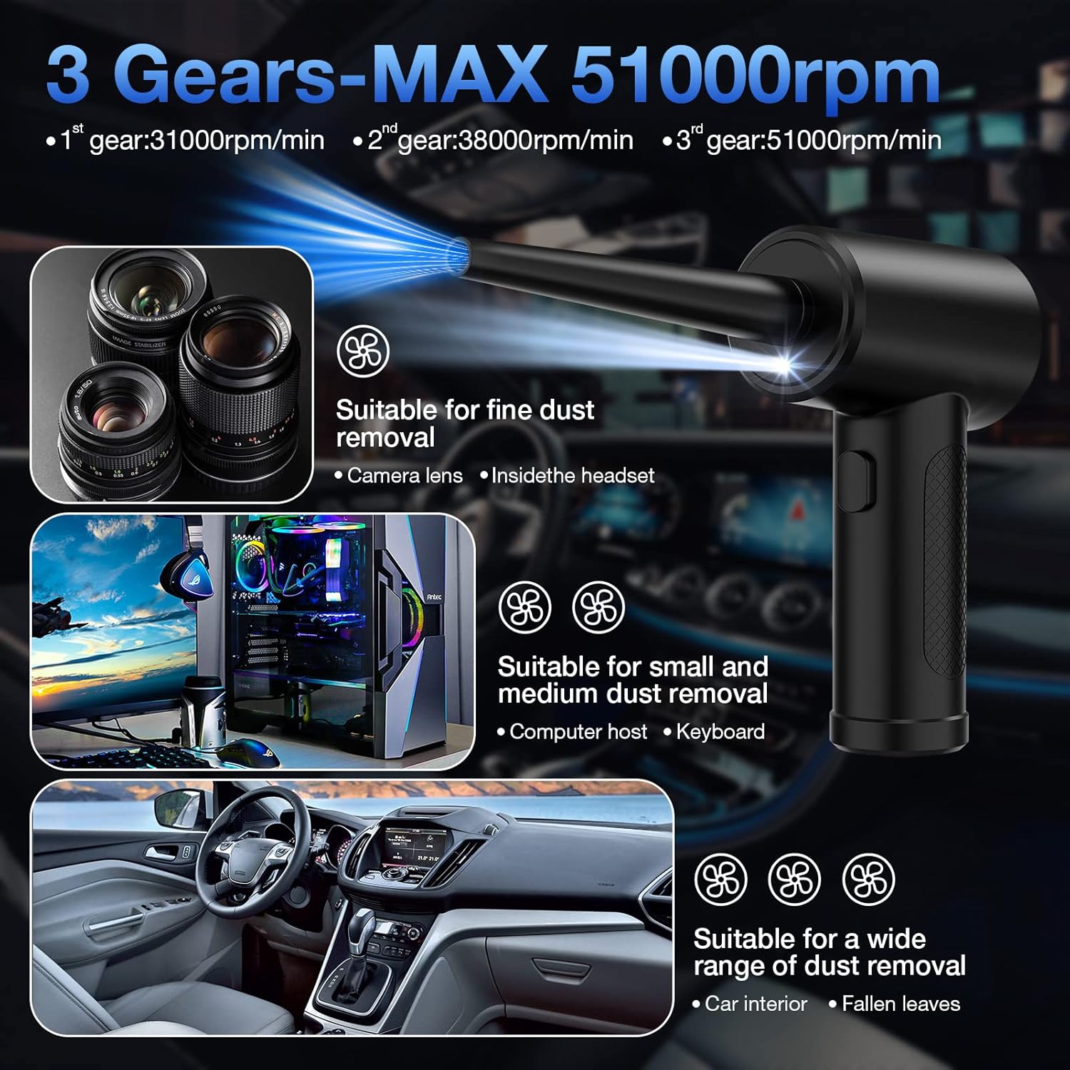 - TRUE 51000RPM: Our air duster adopters the most advanced motor, the maximum speed can reach TRUE 51000RPM, low energy consumption and longer lifespan. Great to help you deep cleaning, computers, Camera, electronic products, or for inflation. The cool tech gifts and electronics for men