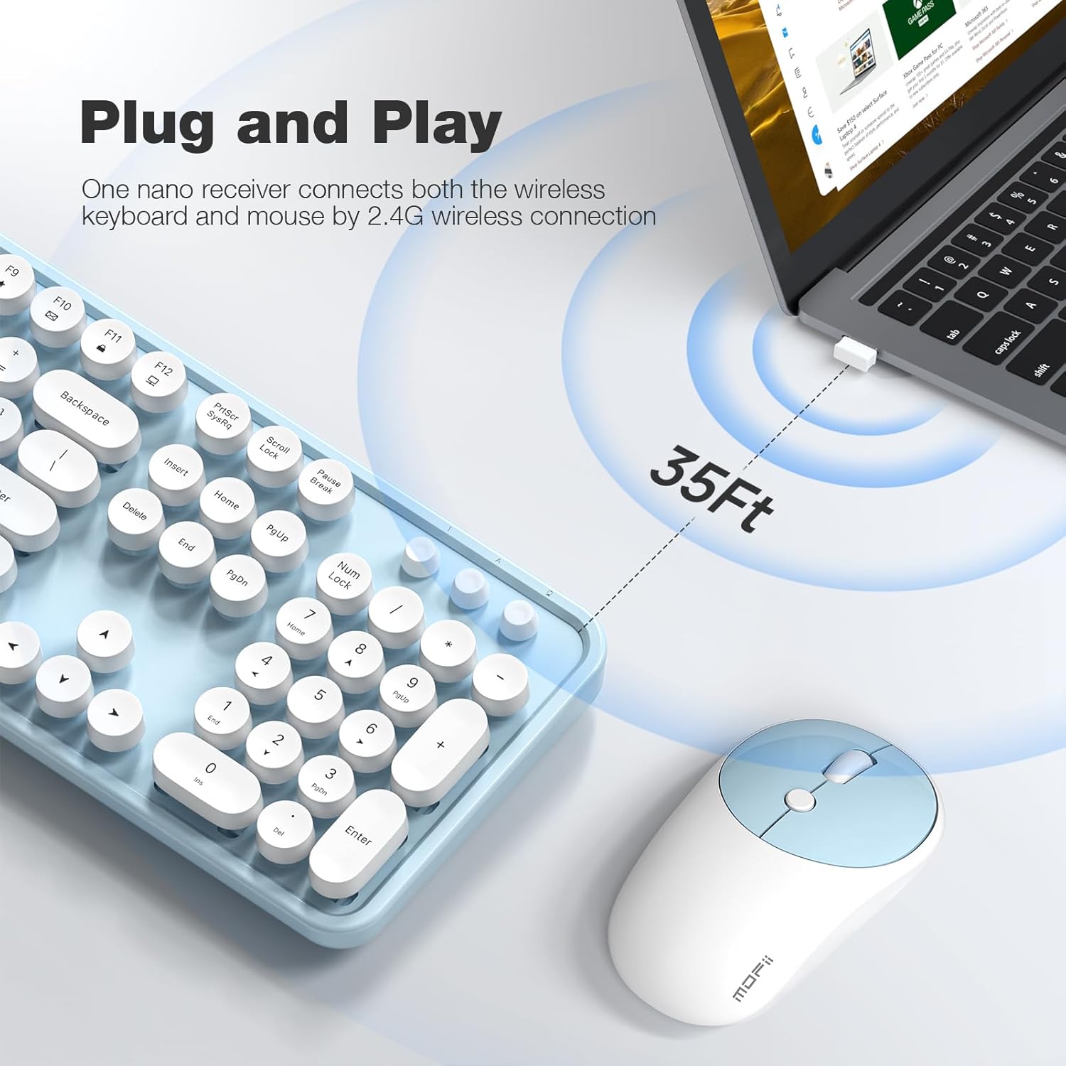 MOFII Wireless Keyboard and Mouse Combo, Computer Full Size 2.4G Plug and Play Wireless Typewriter Retro Round Keyboard and Mouse Set for Windows, Computer, Desktop, PC, Notebook - (Light Blue)