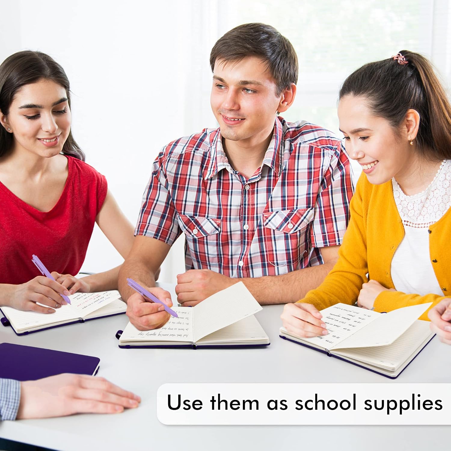 - Feela 24 Pack Classic Ruled Notebooks contains 24 purple ruled sturdy cover notebooks and 24 Black Retractable Pens. Each of the notebooks measures 8.3” x 5.1”, which is perfect to carry and easily held by young girls and boys. These black cute pens are customized to be placed in the pen holder, which is pretty convenient.