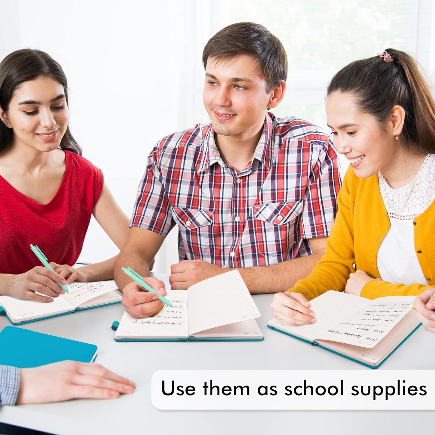 - Feela 24 Pack Classic Ruled Notebooks contains 24 teal ruled sturdy cover notebooks and 24 Black Retractable Pens. Each of the notebooks measures 8.3” x 5.1”, which is perfect to carry and easily held by young girls and boys. These black cute pens are customized to be placed in the pen holder, which is pretty convenient.