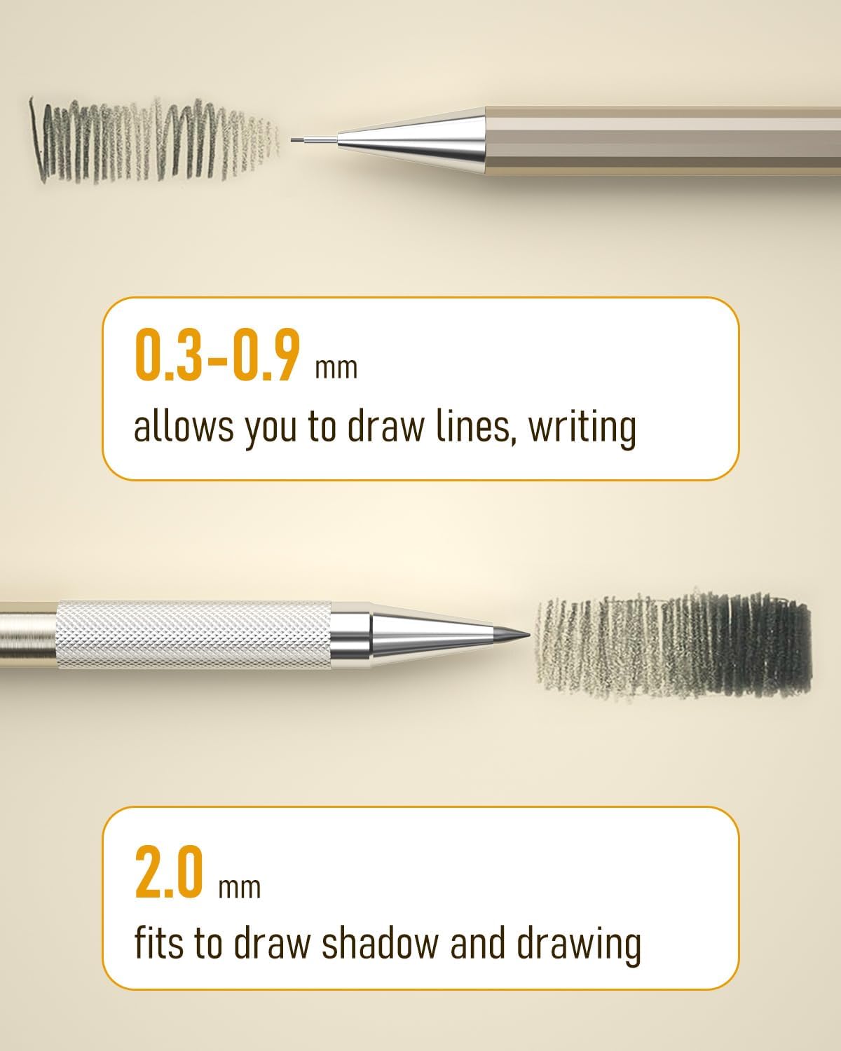 - 【4 PCS Mechanical Pencils】: 4 mm tip length makes it ideal for use with rulers and templates, various line size (0.3 mm,0.5 mm,0.7 mm & 0.9 mm) satisfy your demand. Polygon shape of these mechanical writing pencils avoids sliding on drawing tables. In addition, the pencil is pre-loaded with a 90mm-lead. (with each 60pcs extra lead refill for 0.3, 0.5, 0.7, and 40pcs 0.9 pencil lead refill.)