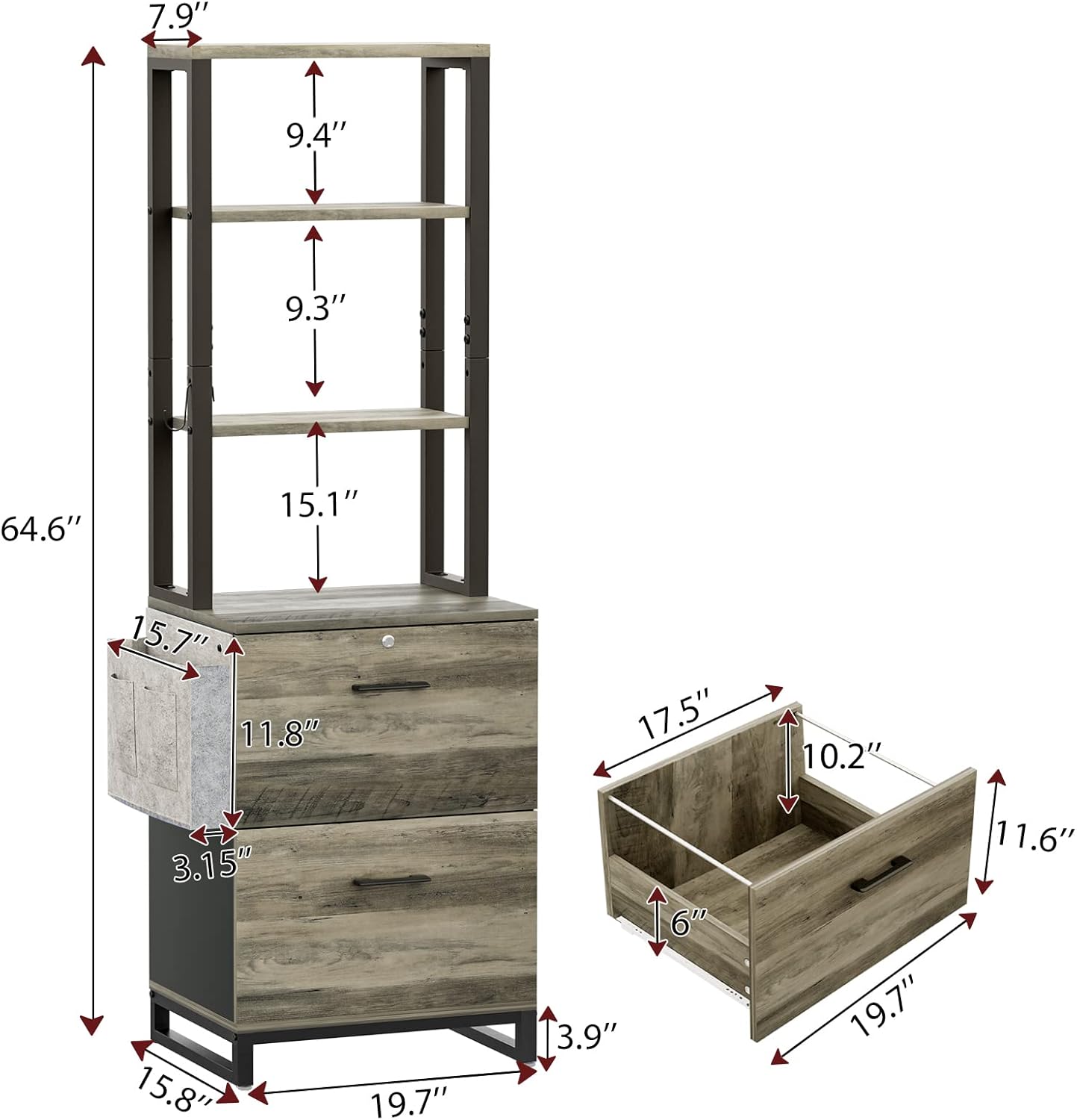 - 【Ample Storage Space】 19.68" L x 15.7"W x 64.56" H file cabinet is perfect for your home office. 6 tier shelf tall file cabinet provides enough room to hold bookshelf, printer, photocopier, etc. And side storage bag can hold books, file for your home office. The hook can be used to hang headphones, cap, etc.