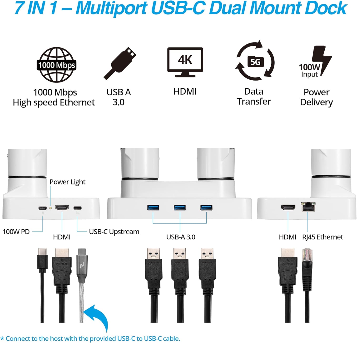 - 7 in 1 Docking Station Base - The monitor base doubles as a 7-port docking station, featuring 3x USB-A 3.0 ports (5Gbps), 2x HDMI ports (MST), 1x RJ45 Ethernet port (1Gbps), and 1x 100W PD Input port. Must use a supported Full-functioned USB-C 3.1 Gen 2 Port (or above) (must support transferring data, audio, video, and power.)