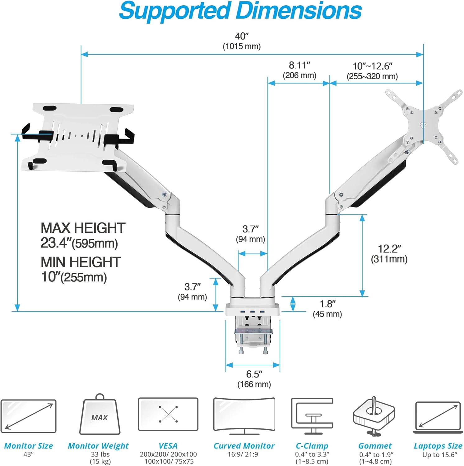 - Attachable Laptop Tray - Versatile and adaptable. Use either as a dual monitor mount, or as a single monitor mount with a laptop holder to accommodate your laptop, tablet, or keyboard, providing you with optimal flexibility and functionality.