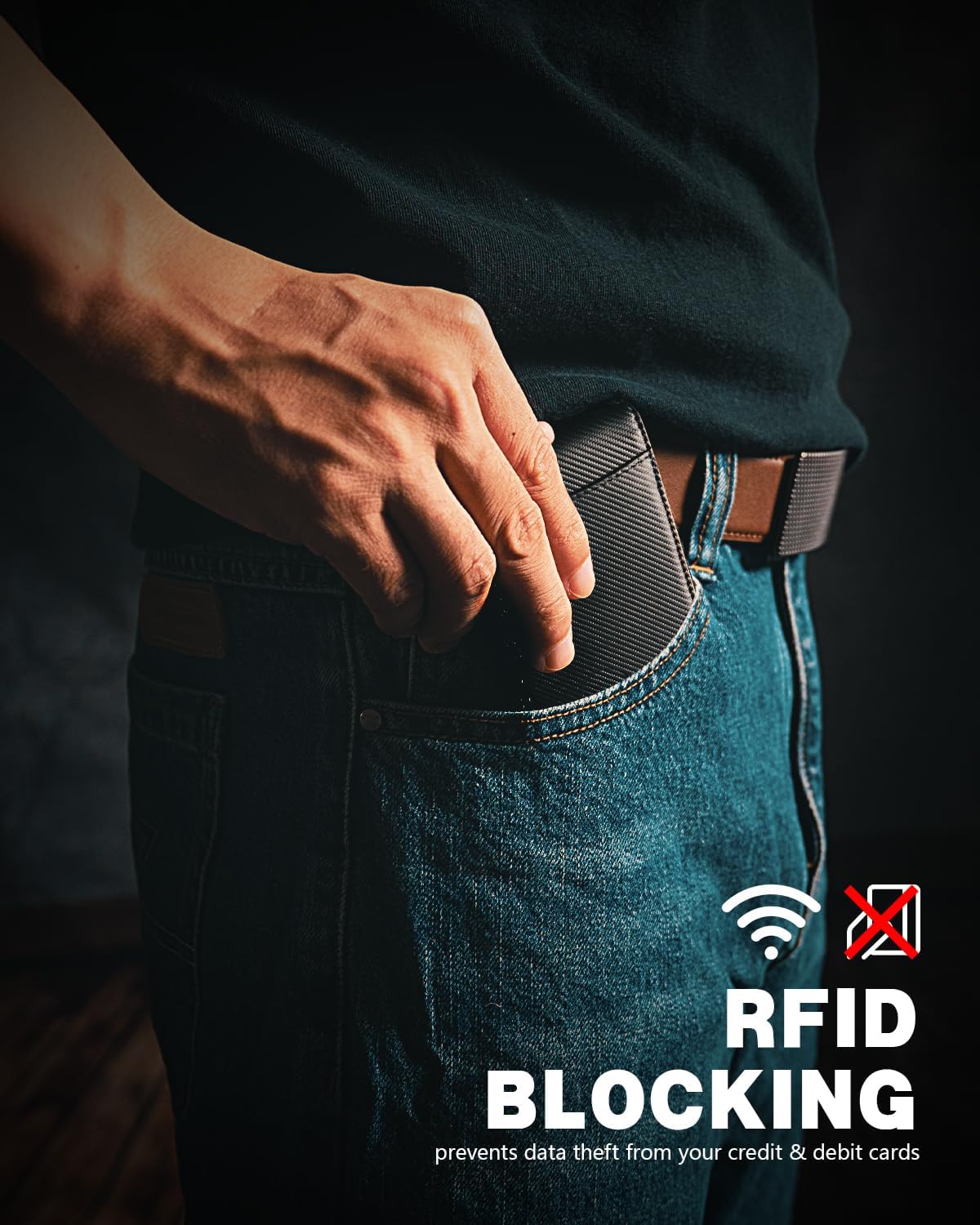 • RFID Anti-Theft SECURITY - This slim wallet for men is equipped with German Institute Certified RFID Security technology, a unique metal composite, engineered specifically to block 13.56 MHz or higher RFID signals to protect the valuable information and privacy
